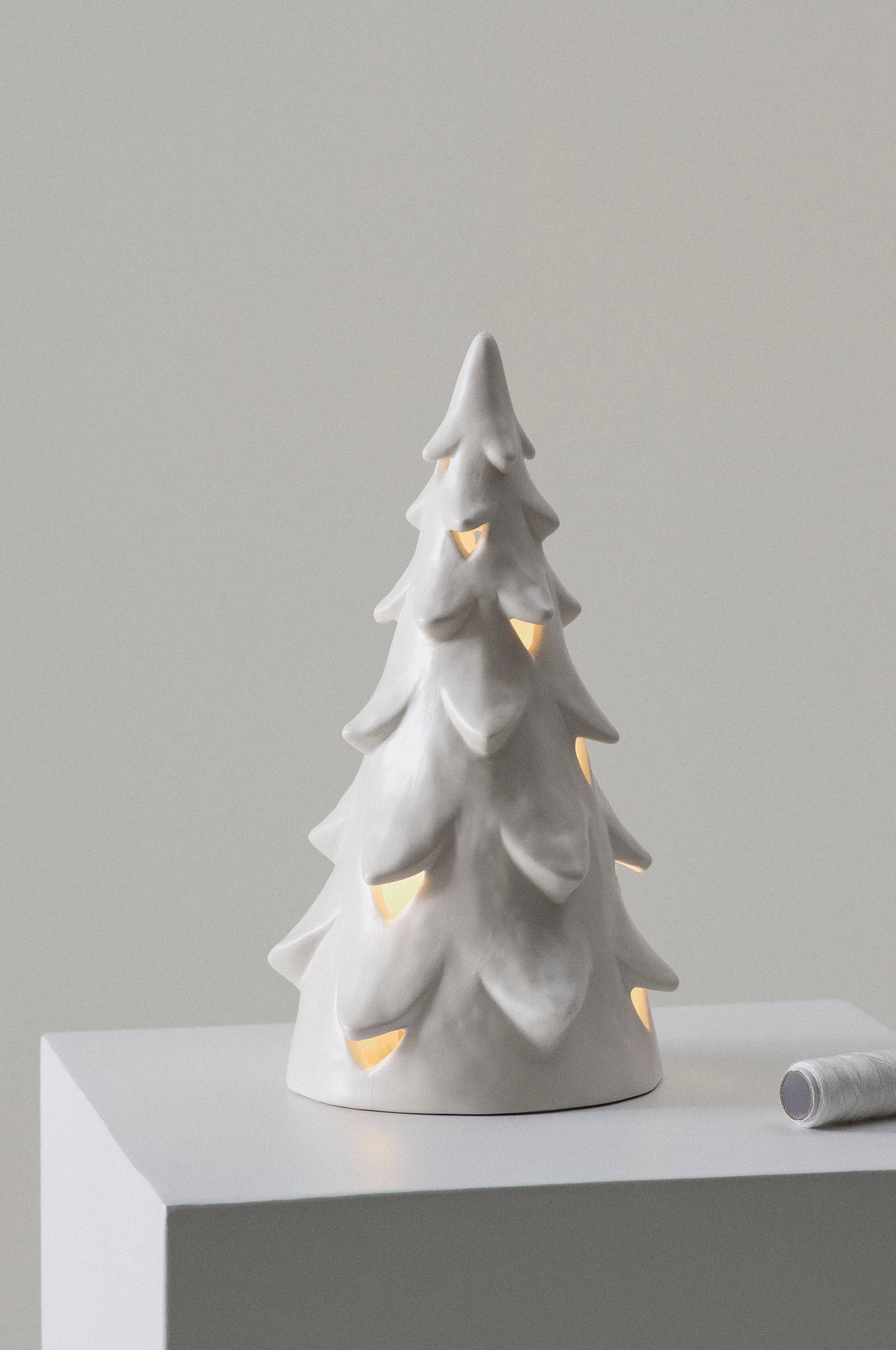 Handgefertigter Tannenbaum aus Dolomit-Porzellan mit LED-Licht, das durch die Öffnungen im Baum scheint und eine stimmungsvolle Atmosphäre verströmt. Betrieb mit 2 AA-Batterien (gesondert erhältlich). Da das Modell von Hand gefertigt wird, ist jedes Exemplar ein Unikat. Kerzen sind nic_Dolomit-Porzellan.Größe_ Höhe 25 cm, Ø 14 cm.Pflegehinweis_ Feucht abwischbar.Tipp_ GNISTRA sorgt auch überall dort für ein gemütliches Licht, wo es keinen Stromanschluss gibt_ht enthalten.