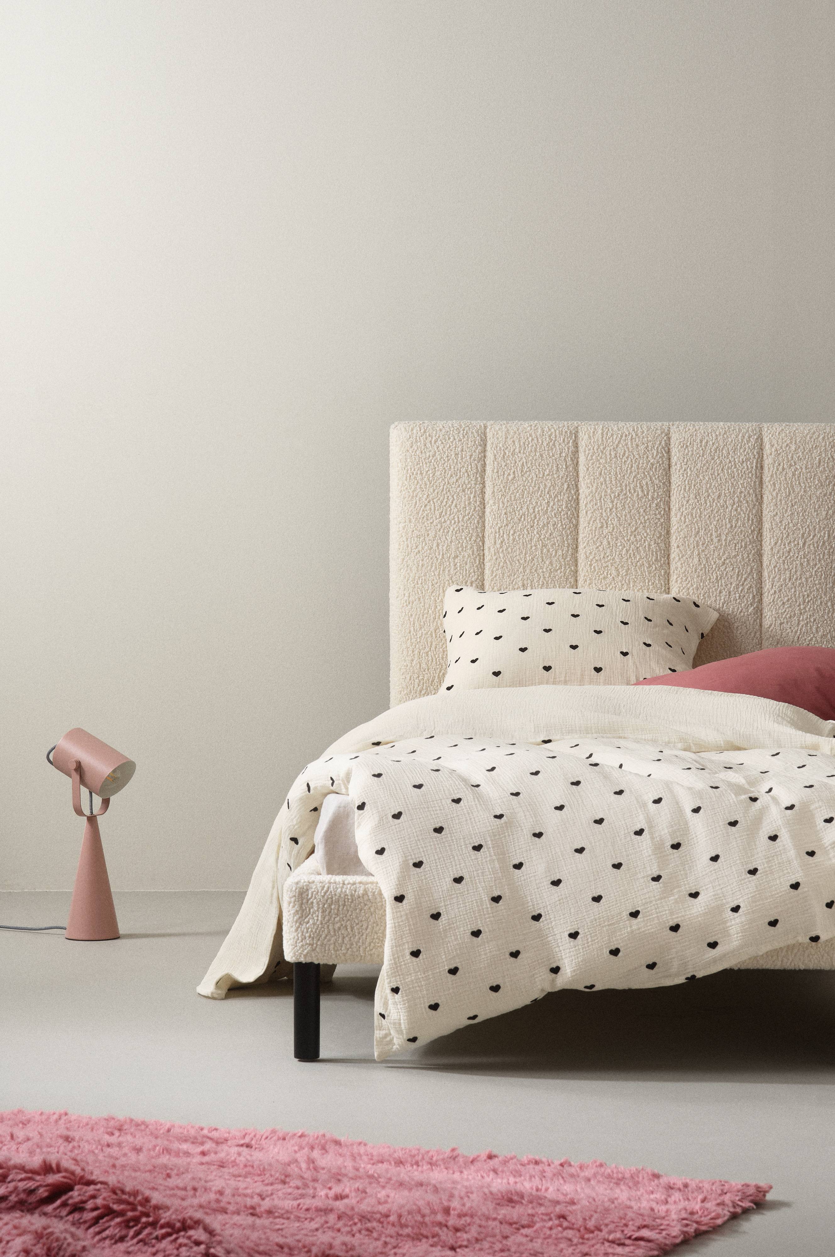 Bettbezug aus wunderbar weichem Bio-Baumwollmusselin mit aufgestickten Herzen. Musselin ist ein zweilagiges, leichtes Gewebe, das dank seiner etwas gecrinkelten Struktur besonders weich und pflegeleicht ist. Bügeln oder Mangeln sind hier nicht erforderlich. In Musselin lässt sich überaus behaglich schlummern. Fadendichte 178 TC. (Mit der Fadendichte bzw. dem TC-Wert (Thread Count) wird die Anzahl der Fäden in Kette und Schuss pro Quadratzoll angegeben. Je höher die Fadendichte, desto höher die Qualität.)