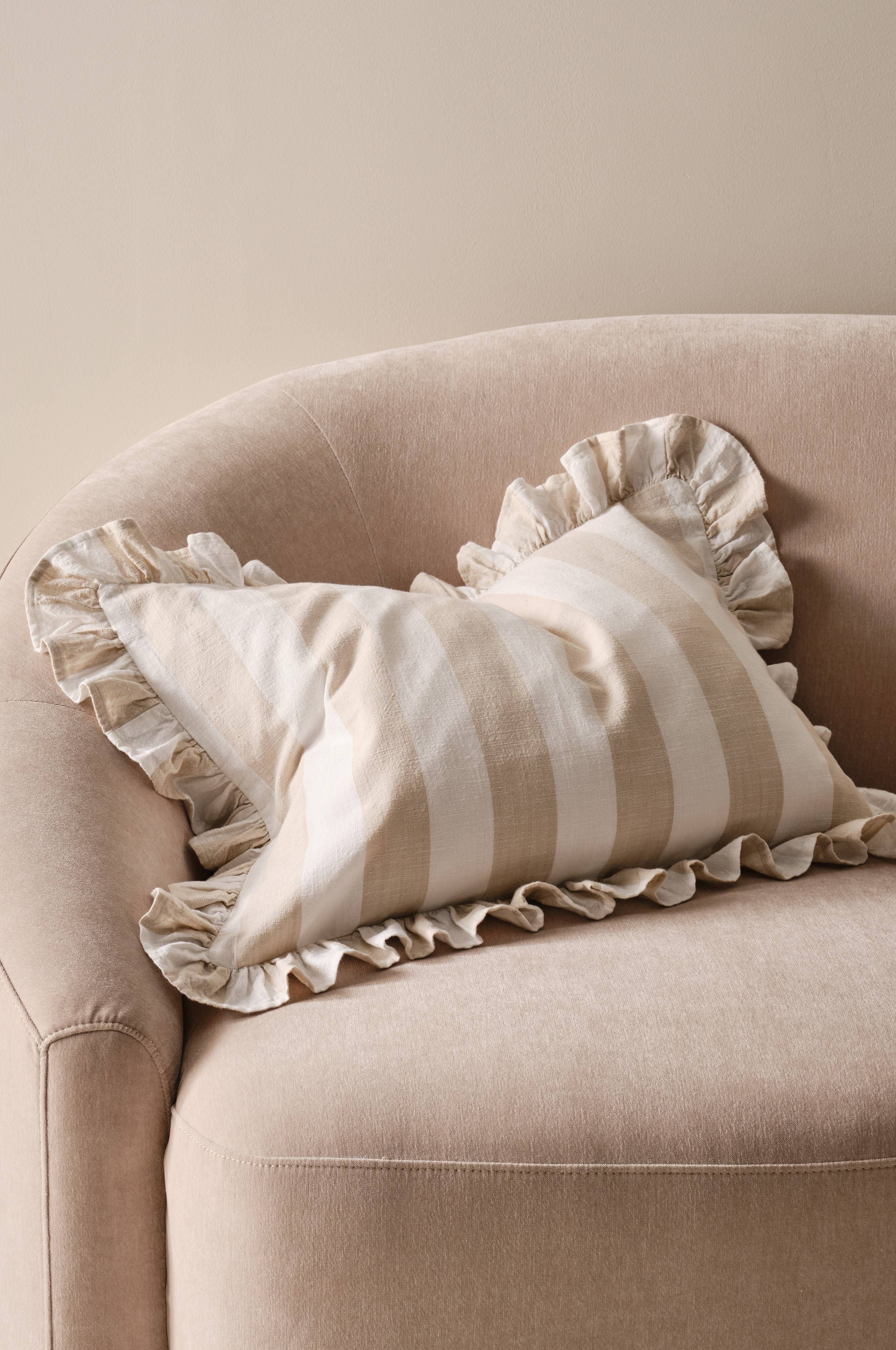 Der Kissenbezug IRIS wertet deine Einrichtung mit seinem Vintage-Look und dem Volant-Detail auf. Der weiche Baumwollstoff mit seinem garngefärbten Streifenmuster verleiht jedem Raum einen zeitlosen Charme. Dieser Kissenbezug ist ideal für alle, die auf der Suche nach einem trendigen Design sind, denn er bietet sowohl Stil als auch Textur.