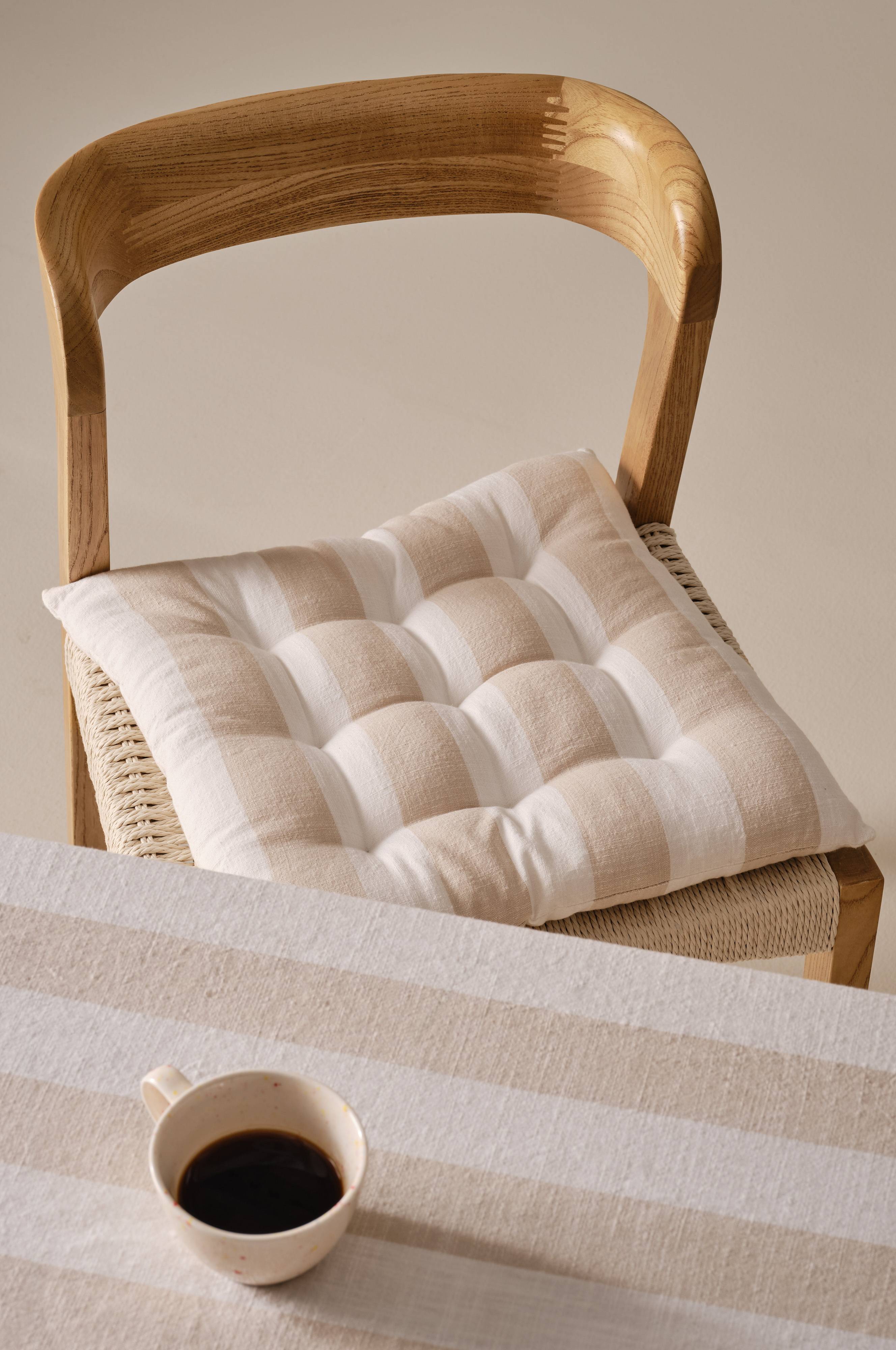 Das Sitzkissen IRIS hat mit seinem garngefärbten Streifenmuster und dem weichen Baumwollstoff einen Vintage-Charme. Sein Design strahlt Wärme und Charakter aus und passt zu jeder trendigen Einrichtung. Die Polyesterpolsterung garantiert Komfort und Struktur und macht das IRIS-Sitzkissen zu einem eleganten Accessoire für moderne und klassische Möbel, das jedes Interieur mühelos aufwertet.