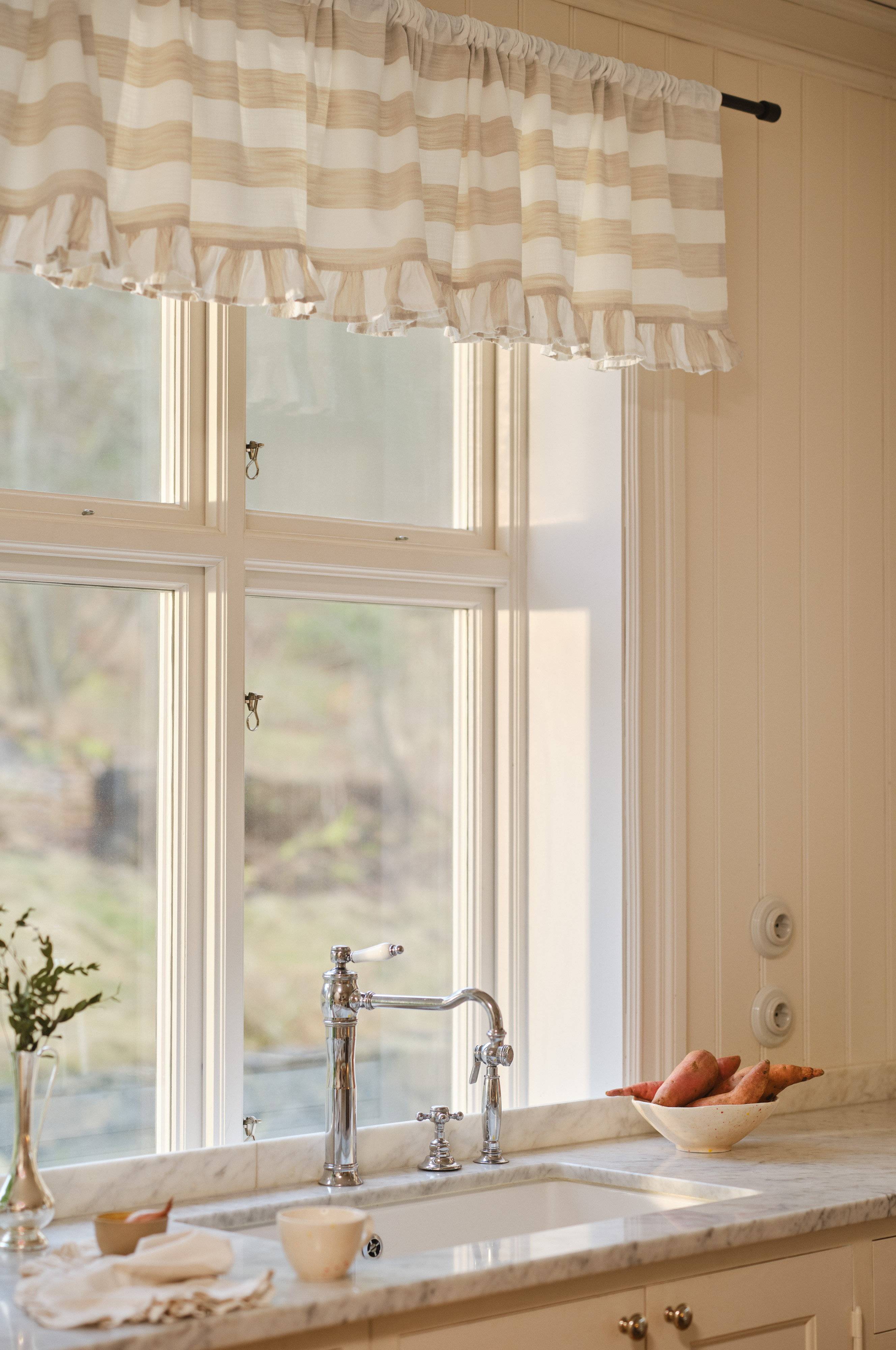 Der Vorhang-Volant IRIS bringt mit seinem Vintage-Charme einen zeitlosen Charme in deine Einrichtung. Der weiche Baumwollstoff verspricht Komfort und Eleganz. Das garngefärbte Streifenmuster sorgt für ein subtiles visuelles Interesse, während der Volant am unteren Rand ein zartes, auffälliges Detail schafft, das perfekt für stilvolle Wohnräume ist.