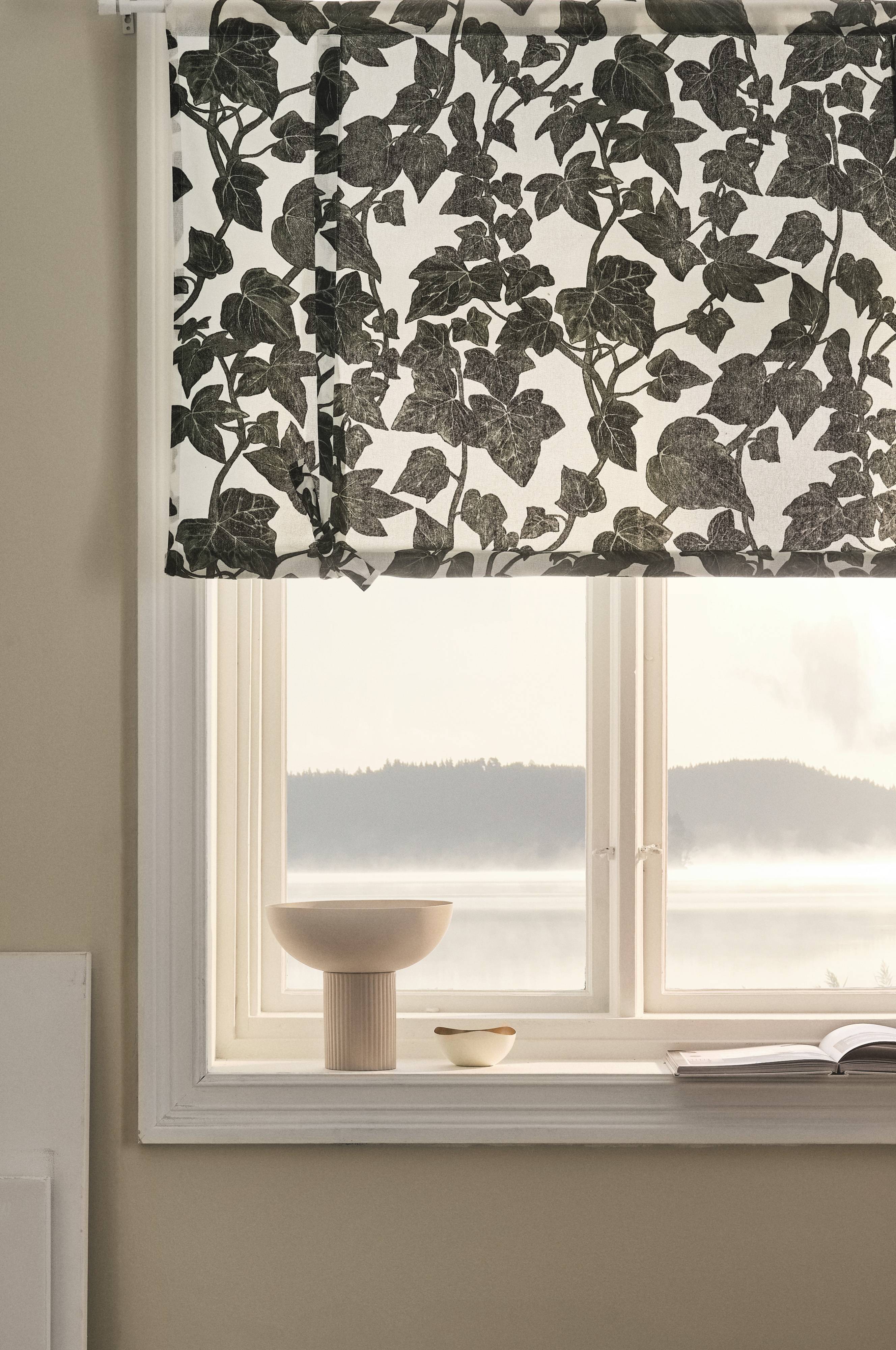 IVY ist eine raffinierte Kollektion aus reiner Baumwolle. Das aufgedruckte Efeumuster auf naturweißem Untergrund wirkt ganz natürlich. Der Stoff weist eine feine Webstruktur auf. Aufhängung an einer normalen Gardinenstange. Die Höhe wird mit Bindebändern reguliert.