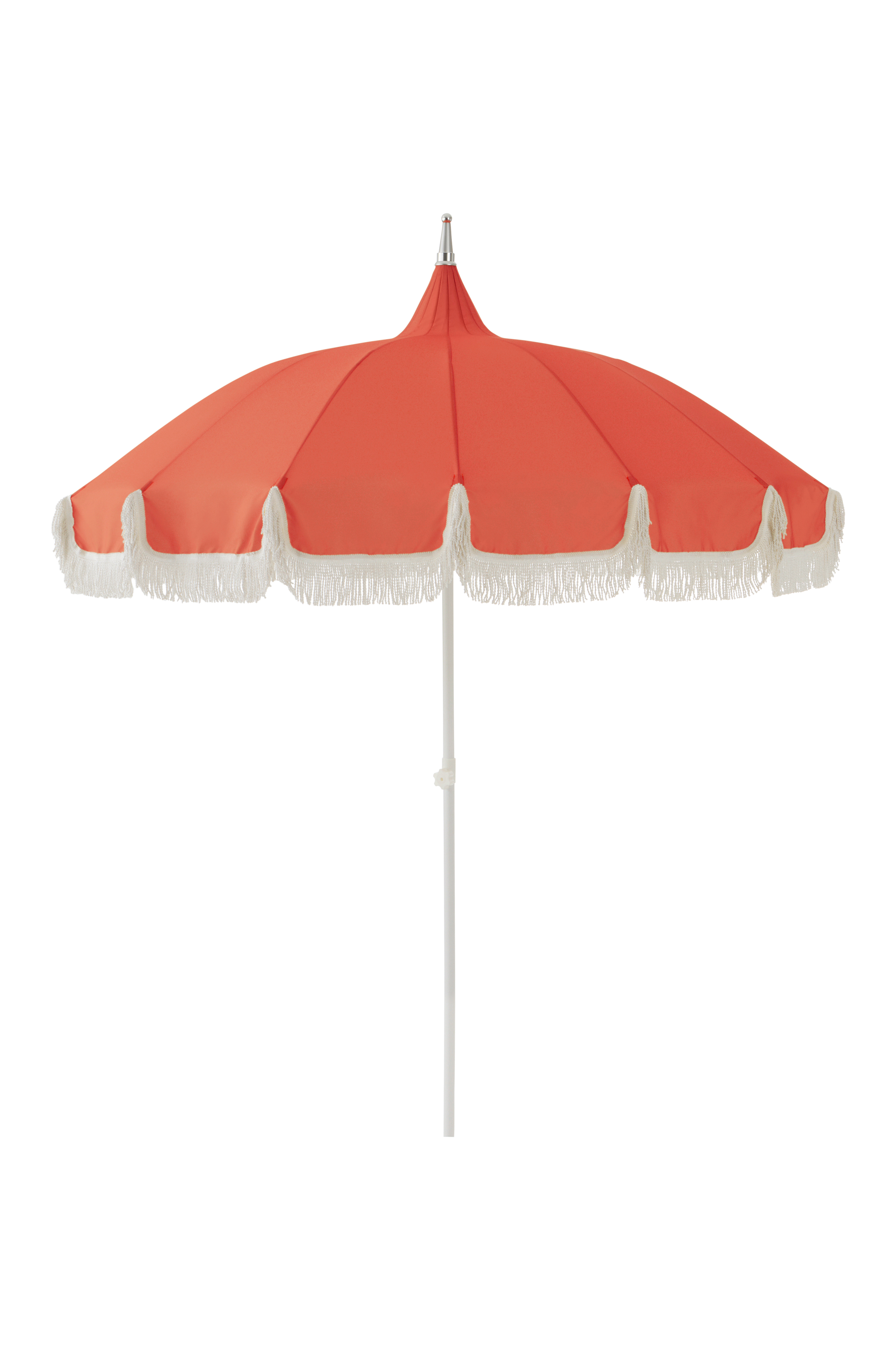 IXIA ist ein Sonnenschirm aus Aluminium mit wasserabweisendem Stoff und Fransen aus Polyester. Die Aluminiumstange in der Mitte lässt sich nicht anwinkeln. Inkl. Sonnenschirmschraube zur Verankerung im Boden/Sand und einer Aufbewahrungstasche. Bitte beachten, dass der Sonnenschirmfuß separat bestellt werden muss.
