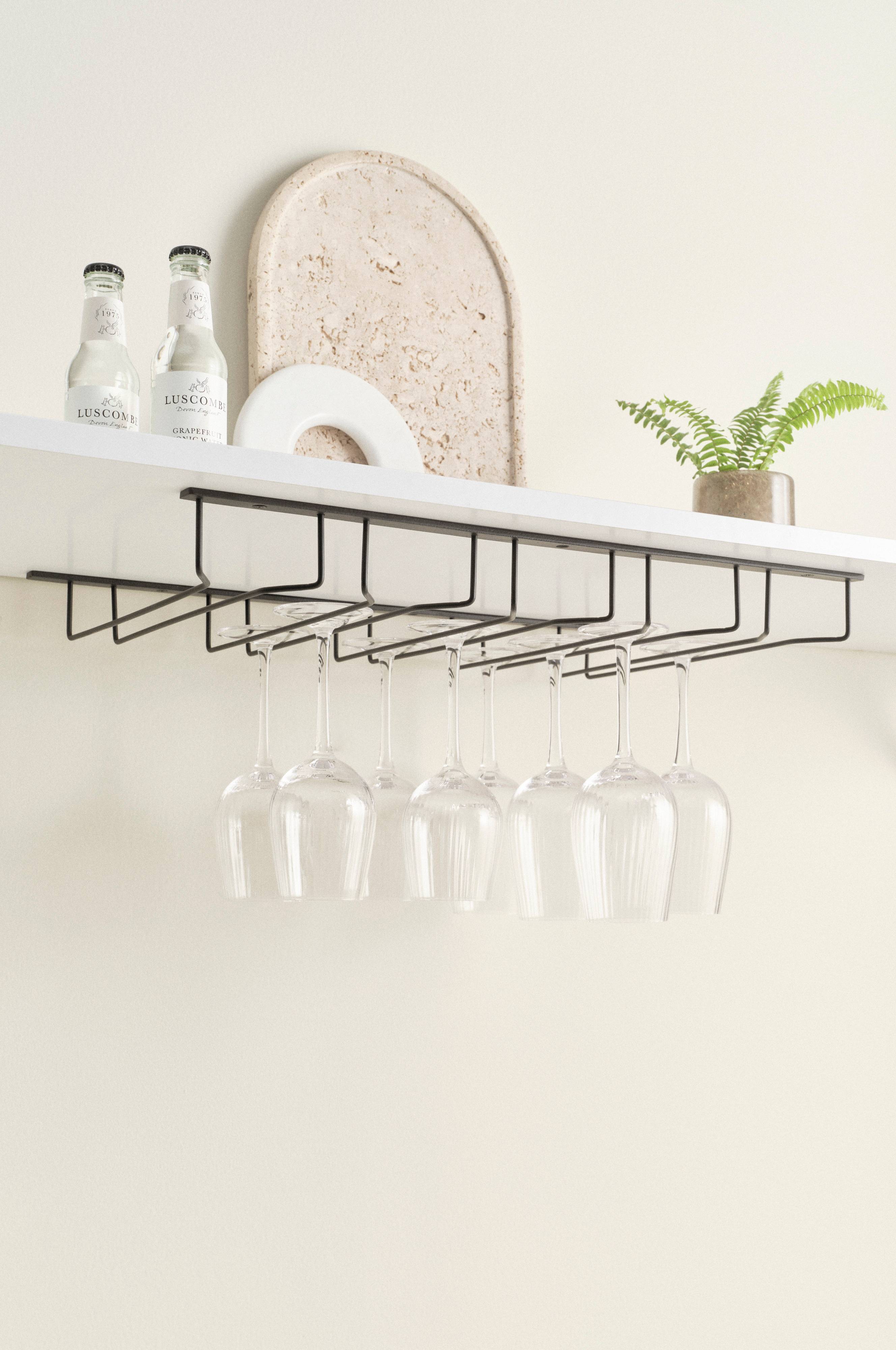 Dieser Weinglashalter aus Eisen ist gleichzeitig rustikal und filigran. Die Gläser werden einfach mit dem Fuß nach oben eingehängt. Der Halter hat fünf Rillen und lässt sich beispielsweise unter ein Regal oder einen Oberschrank schrauben. Dort sorgt er für Ordnung, sieht schick aus und spart gleichzeitig Platz in den Küchenschränken. Der Halter hat eine mattschwarze Lackierung.