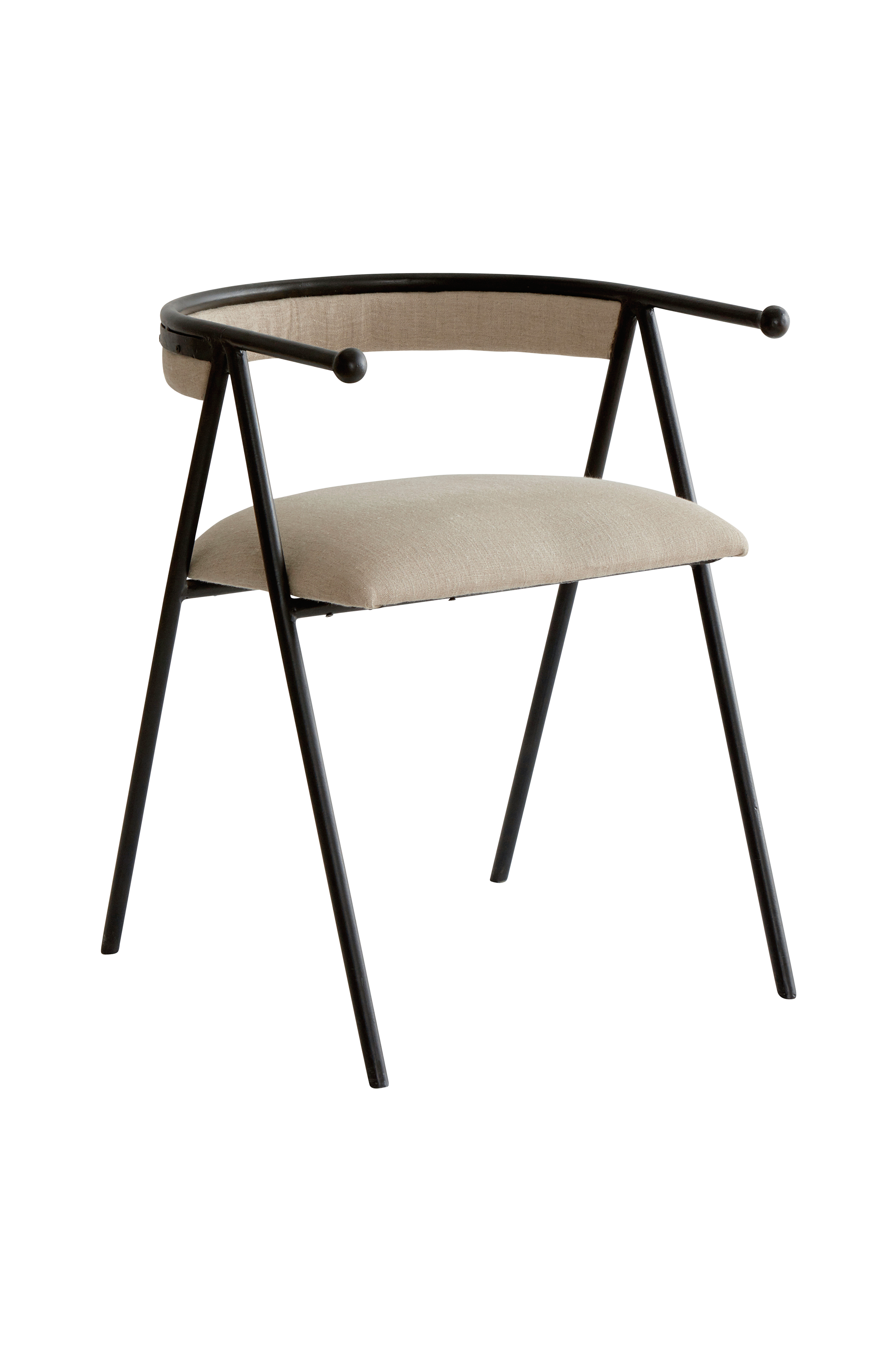 Beschreibung: Armlehnenstuhl mit Metallgestell, einem weich gepolsterten Sitzkissen mit Leinenbezug und gepolstertem, leinenbezogenem Rückenteil.