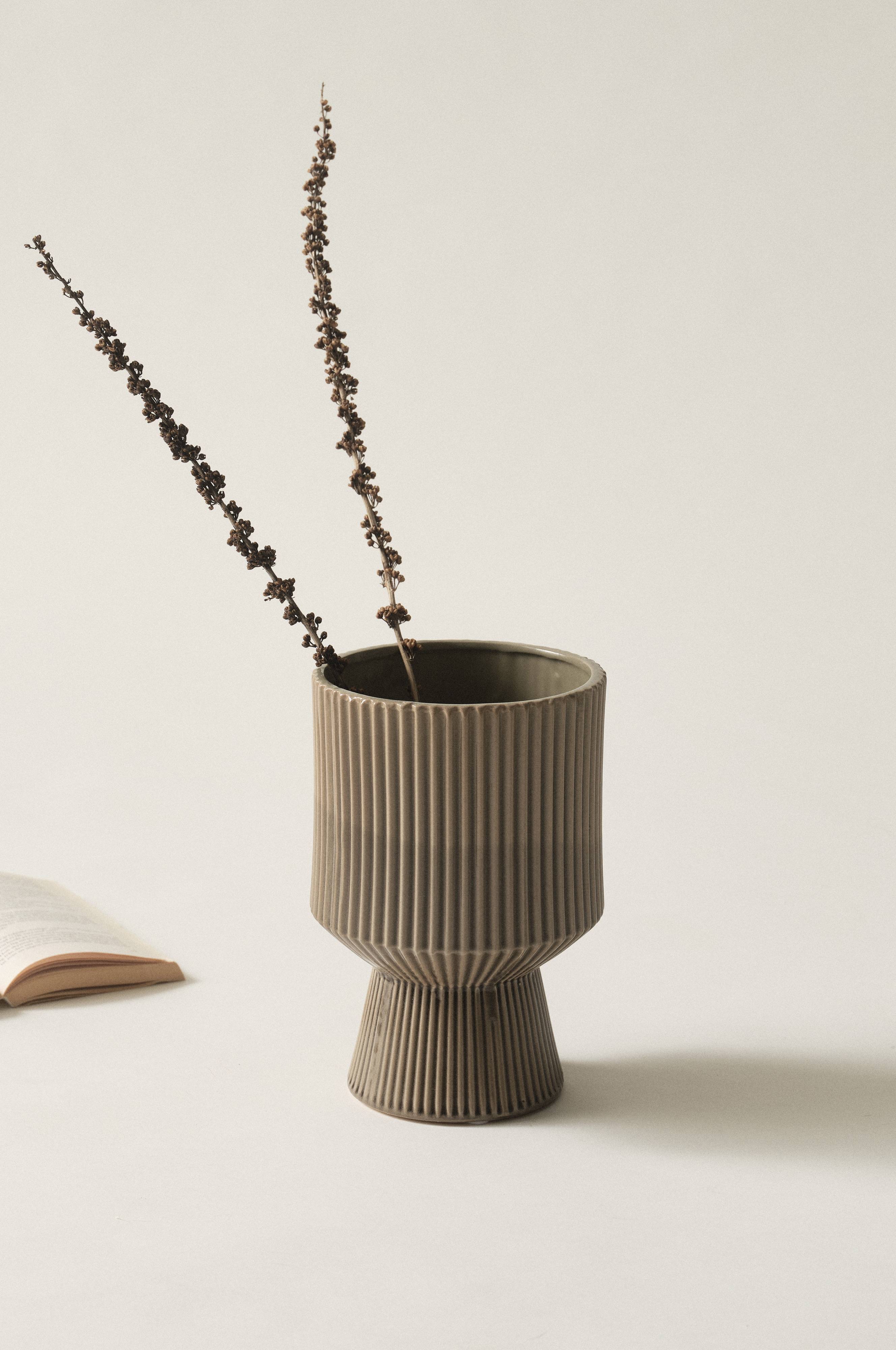 Handgefertigte Keramikvase mit krakelierter Glasur und einem Streifenmuster in einer natürlichen Nuance. In dieser Vase kommen Schnittblumen wunderbar zur Geltung. Auch die Innenseite ist glasiert. Echtes Handwerk - jedes Exemplar ist ein Unikat. Bitte beachten: Keramik ist feuchtigkeitsdurchlässig.