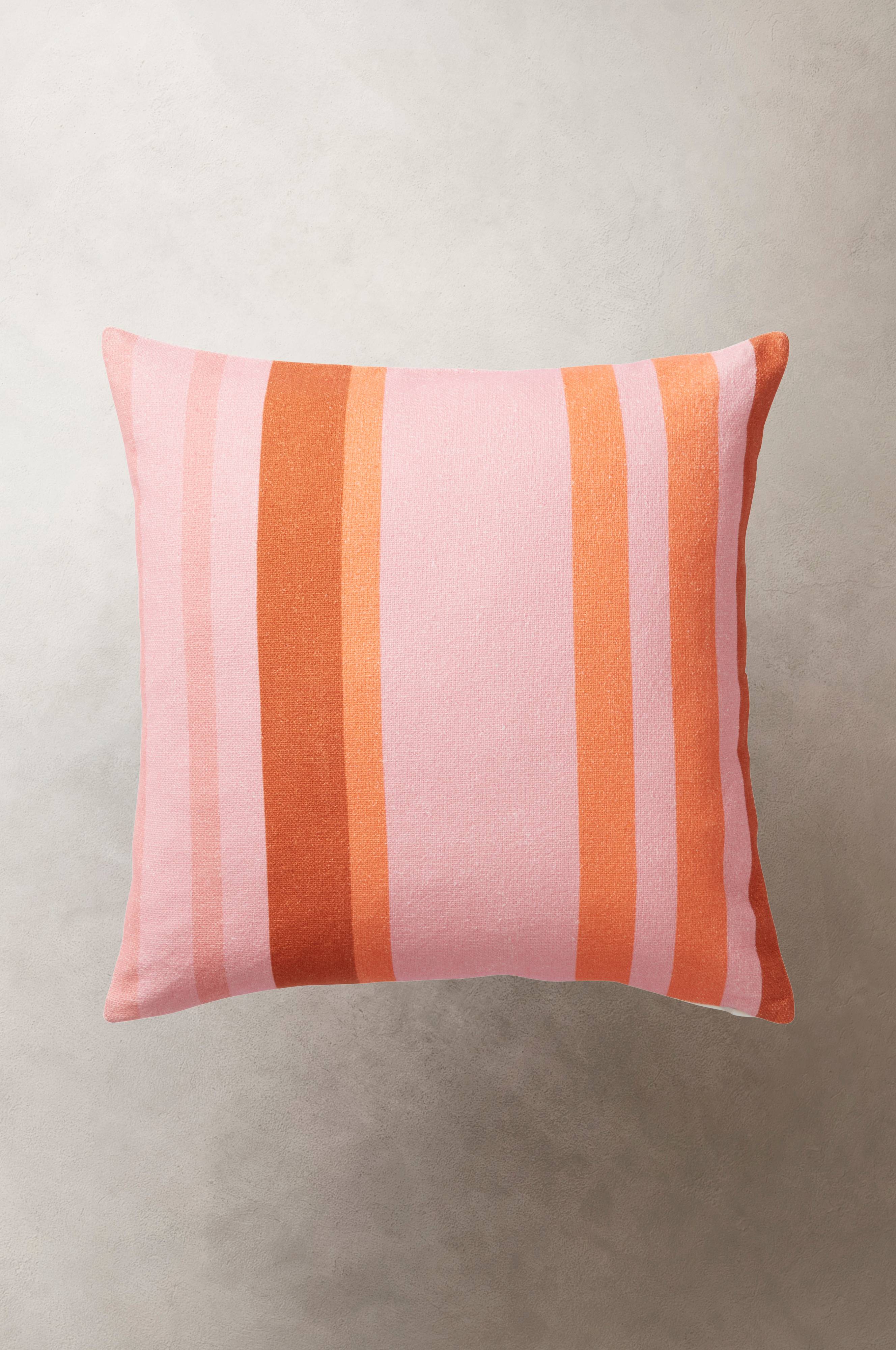 Kissenhülle aus etwas kräftigerer Baumwolle mit Musterprint auf der Vorderseite. Helle, einfarbige Rückseite. Reißverschluss unten.