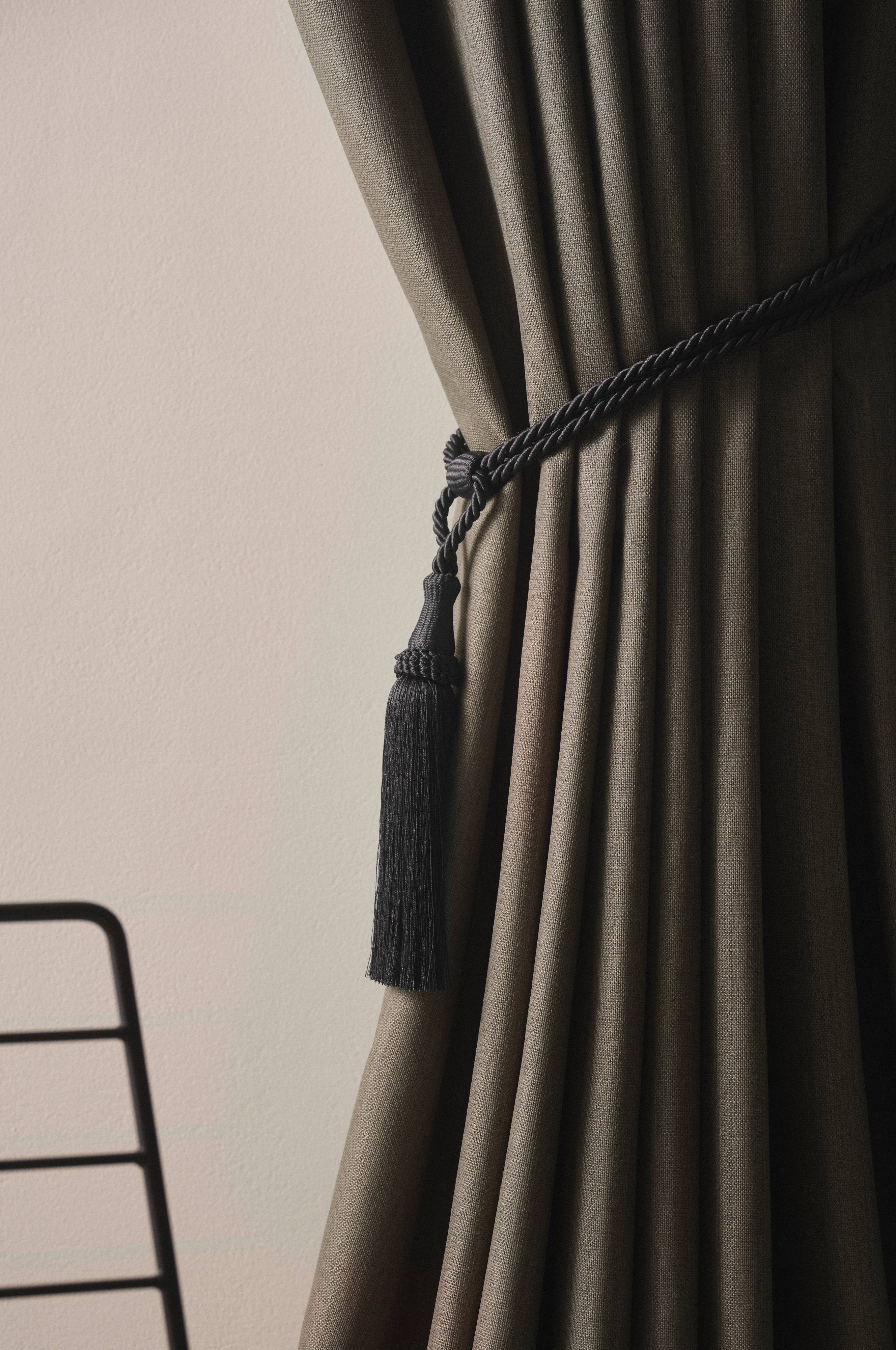 2er-Pack Raffhalter aus Polyester. Die einfarbigen Raffhalter sind mit einer umwickelten Kunststoffperle und einer kräftigen Quaste geschmückt.