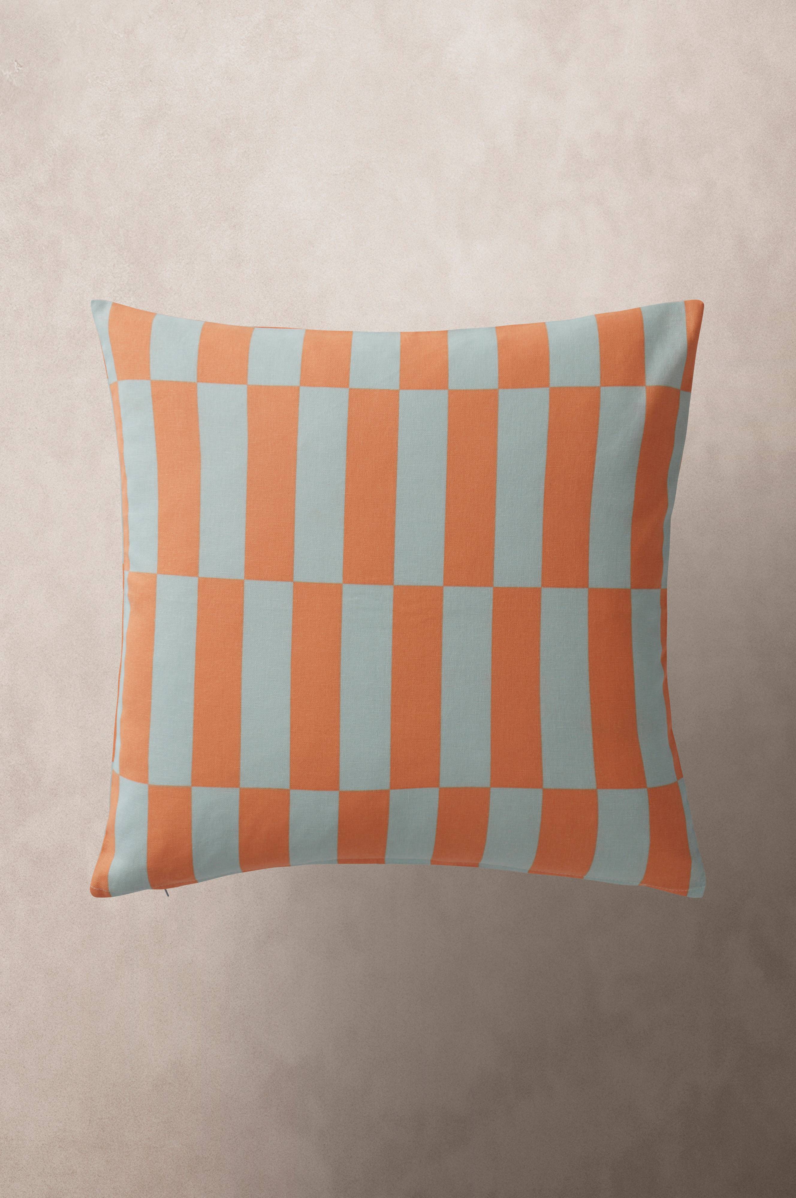 Bei dieser Baumwollkissenhülle bilden die aufgedruckten Streifen ein kontrastreiches Karomuster. Reißverschluss unten. Grammgewicht 170 g/m².