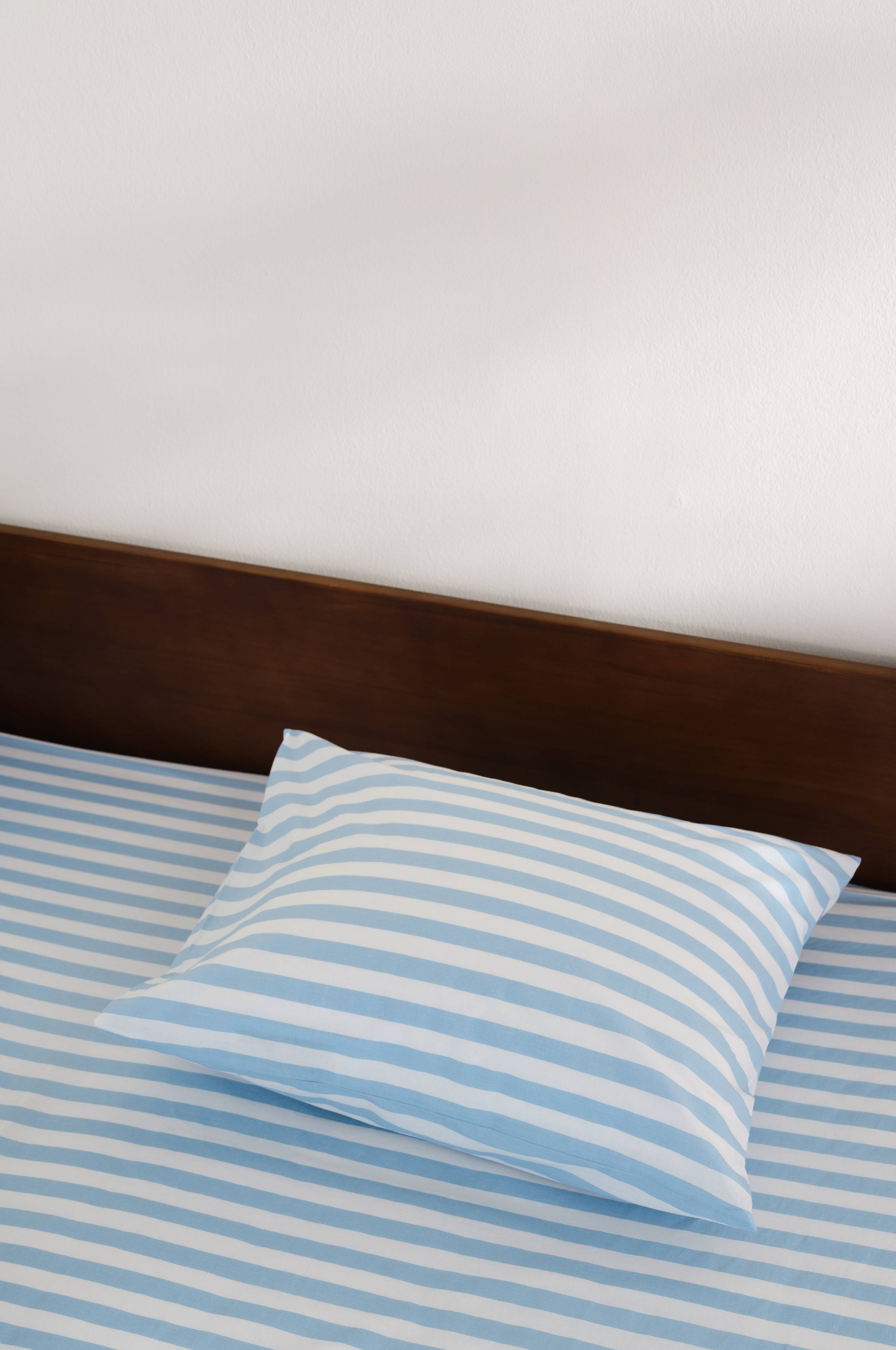Gestreifter Kopfkissenbezug aus Baumwolle. Ein Print mit Querstreifen in sommerlichen Farben ziert beide Seiten dieses Kopfkissenbezugs. Die behagliche, weiche Baumwollqualität fühlt sich angenehm kühl an. Fadendichte 144 TC. (Mit der Fadendichte bzw. dem TC-Wert (Thread Count) wird die Anzahl der Fäden in Kette und Schuss pro Quadratzoll angegeben. Je höher die Fadendichte, desto höher die Qualität. Eine Ausnahme bildet Leinen, denn hier möchte man oft durch etwas lockereres Weben die gewünschte Haptik erzielen.)