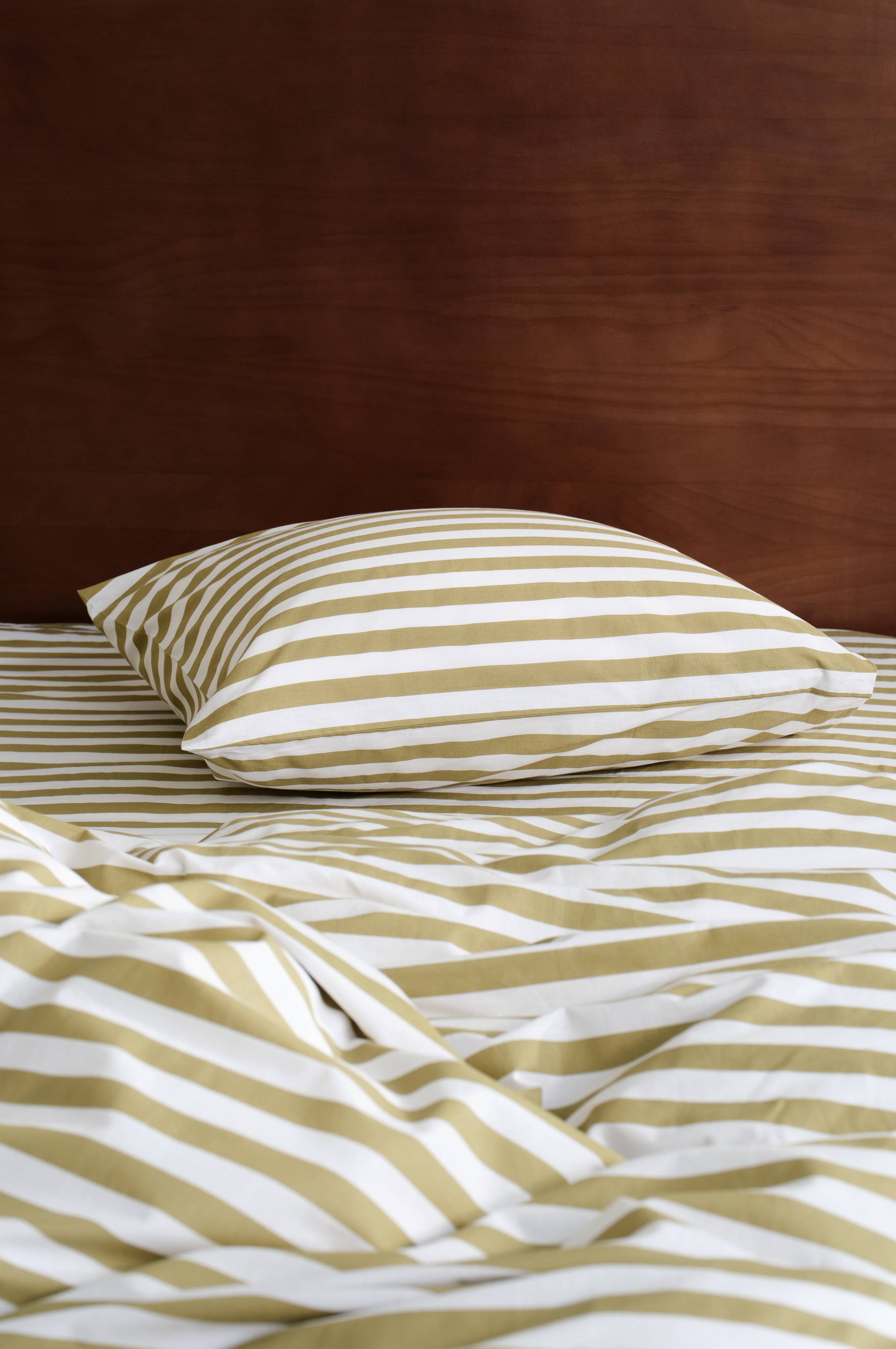 Gestreifter Kopfkissenbezug aus Baumwolle. Ein Print mit Querstreifen in sommerlichen Farben ziert beide Seiten dieses Kopfkissenbezugs. Die behagliche, weiche Baumwollqualität fühlt sich angenehm kühl an. Fadendichte 144 TC. (Mit der Fadendichte bzw. dem TC-Wert (Thread Count) wird die Anzahl der Fäden in Kette und Schuss pro Quadratzoll angegeben. Je höher die Fadendichte, desto höher die Qualität. Eine Ausnahme bildet Leinen, denn hier möchte man oft durch etwas lockereres Weben die gewünschte Haptik erzielen.)