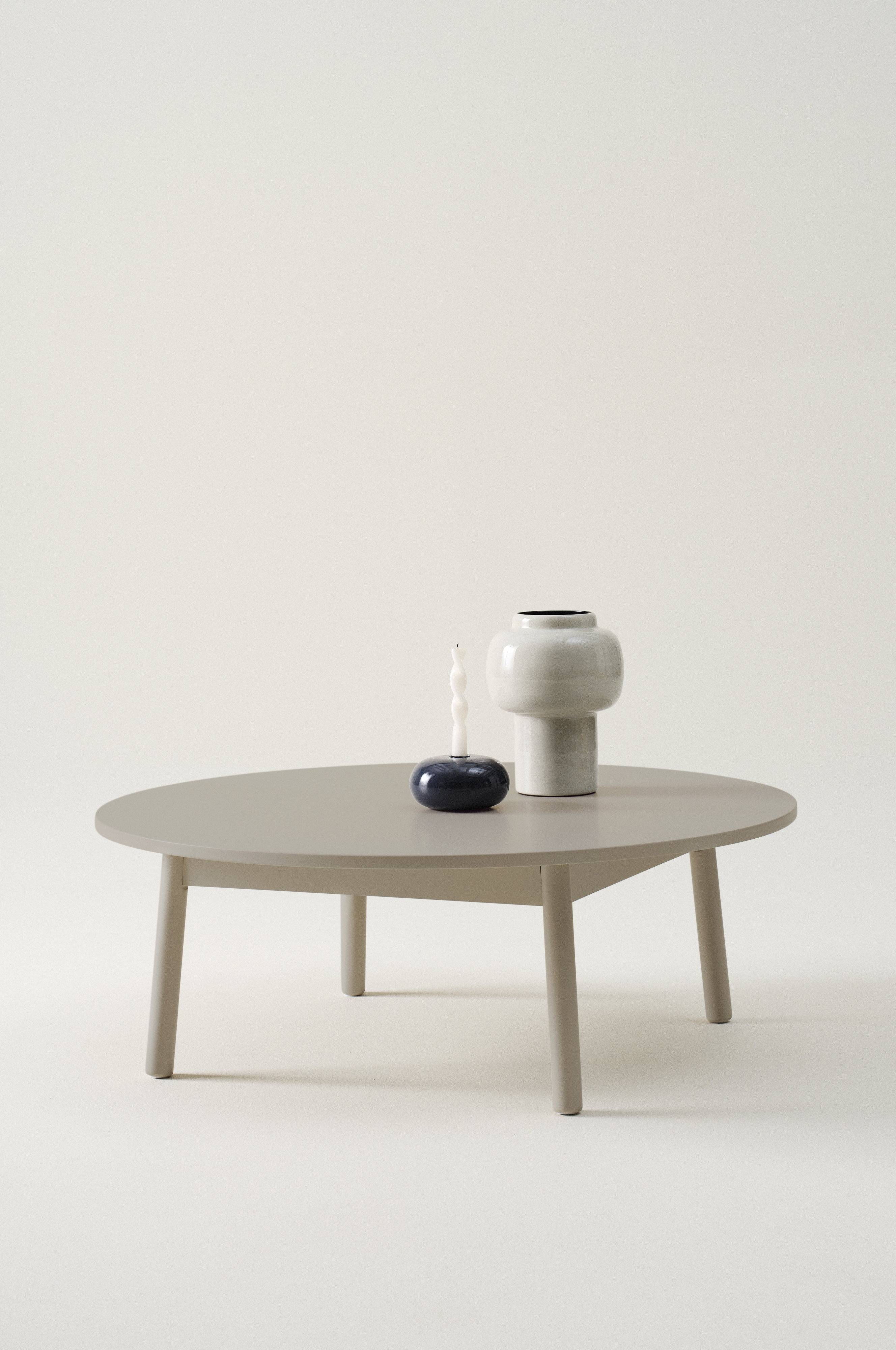 Runder Couchtisch mit einer Tischplatte aus lackiertem MDF und Beinen aus lackierter Kiefer. KINNA ist ein stilvoller Couchtisch in einem reduzierten Design und in verschiedenen weichen und leicht satten Farben erhältlich.