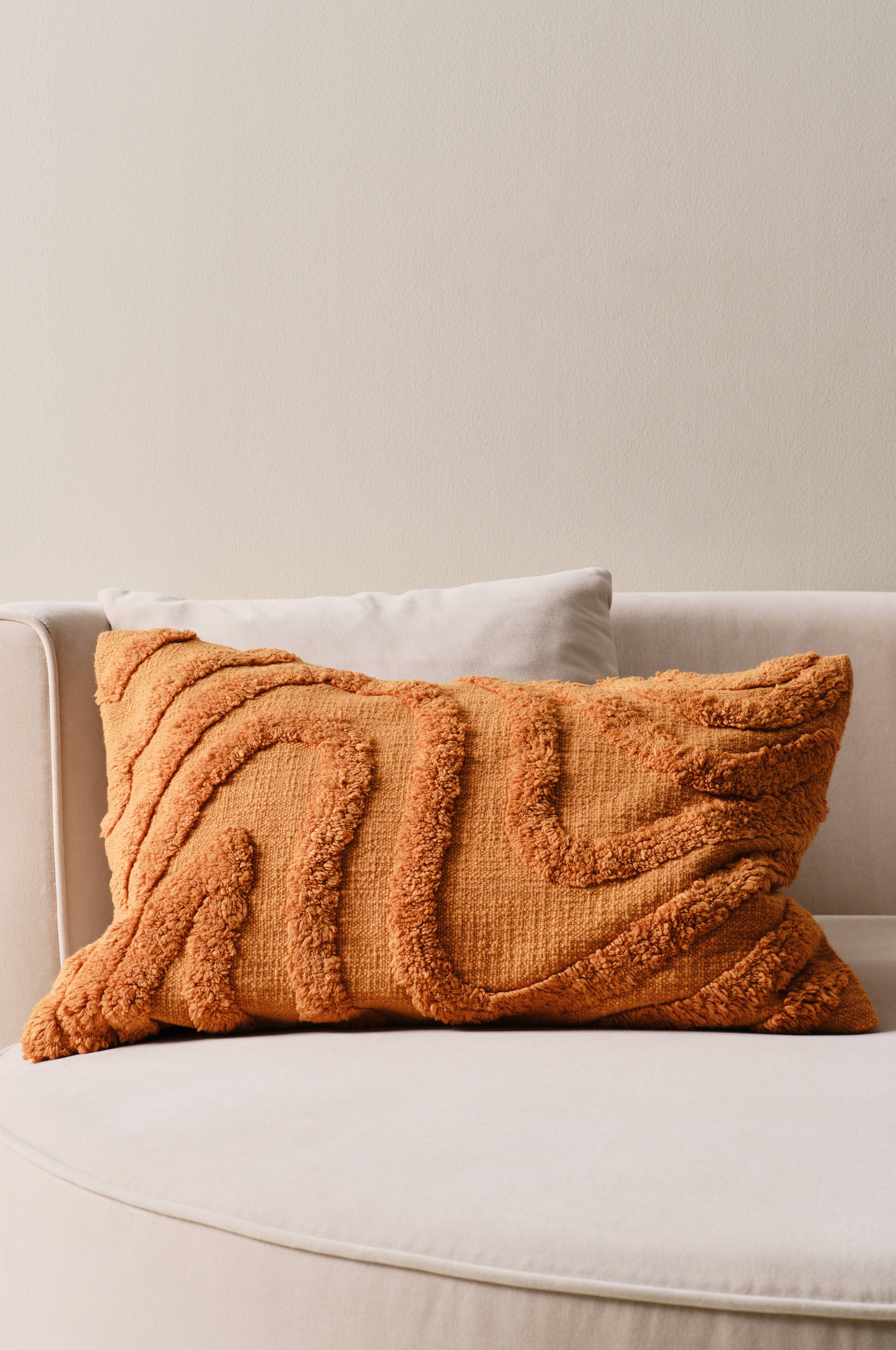 Ein kurzer Flor auf einem kräftigen Gewebe mit Slub-Effekt bildet das getuftete Wellenmuster dieser Kissenhülle. Gefütterte Vorderseite. Naturweiße gewebte Rückseite mit verdecktem Reißverschluss.