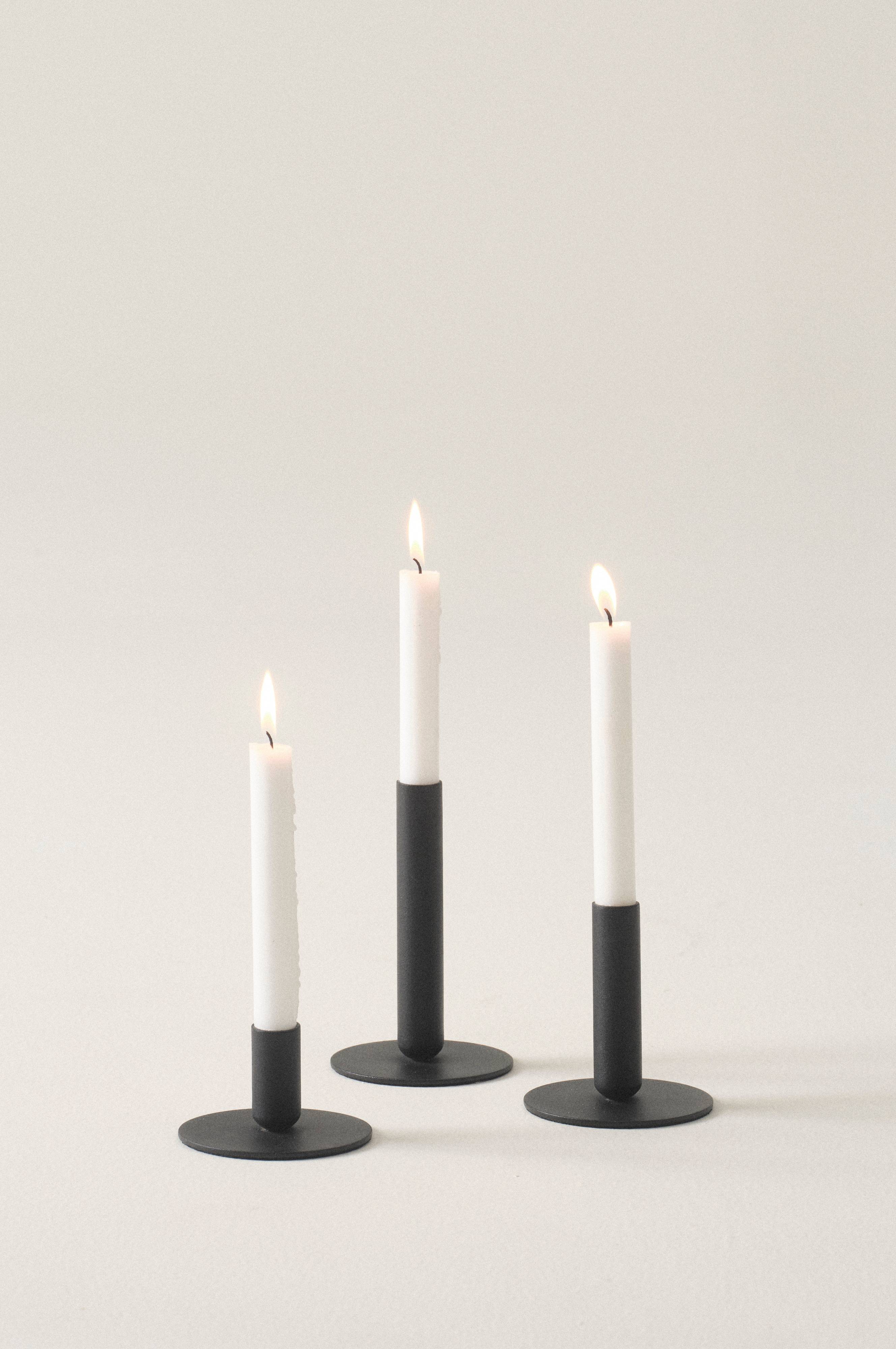 3 Kerzenleuchter aus Eisen. Die drei Kerzenleuchter haben die gleiche Form, sind aber unterschiedlich hoch. Sie sind mit pulverbeschichteter Oberfläche in Mattschwarz zu haben. In der Farbe Gold haben sie ein gebürstetes Finish. Ob in einer Gruppe arrangiert oder in der Tischmitte aufgereiht - die Kerzenleuchter sind immer dekorativ. Kerzen sind nicht enthalten.