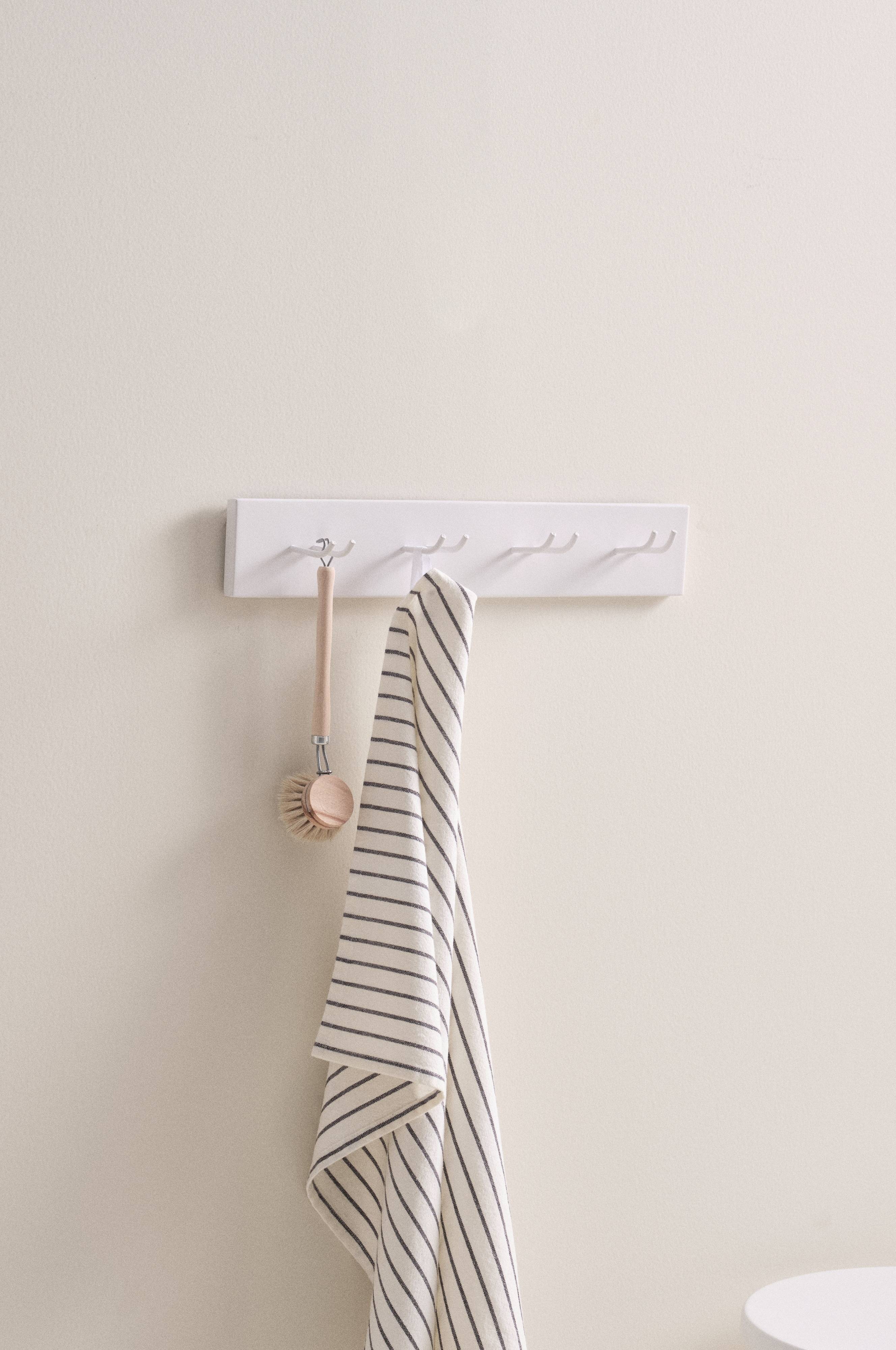 Hakenleiste aus pulverbeschichtetem Metall, mit 4 Doppelhaken. Die geraden Haken sind an den Enden nach oben gebogen und sorgen so dafür, dass Kleidung und Taschen nicht abrutschen. Dank der durchdachten Doppelhaken bieten sich vielfältige Aufhängemöglichkeiten.