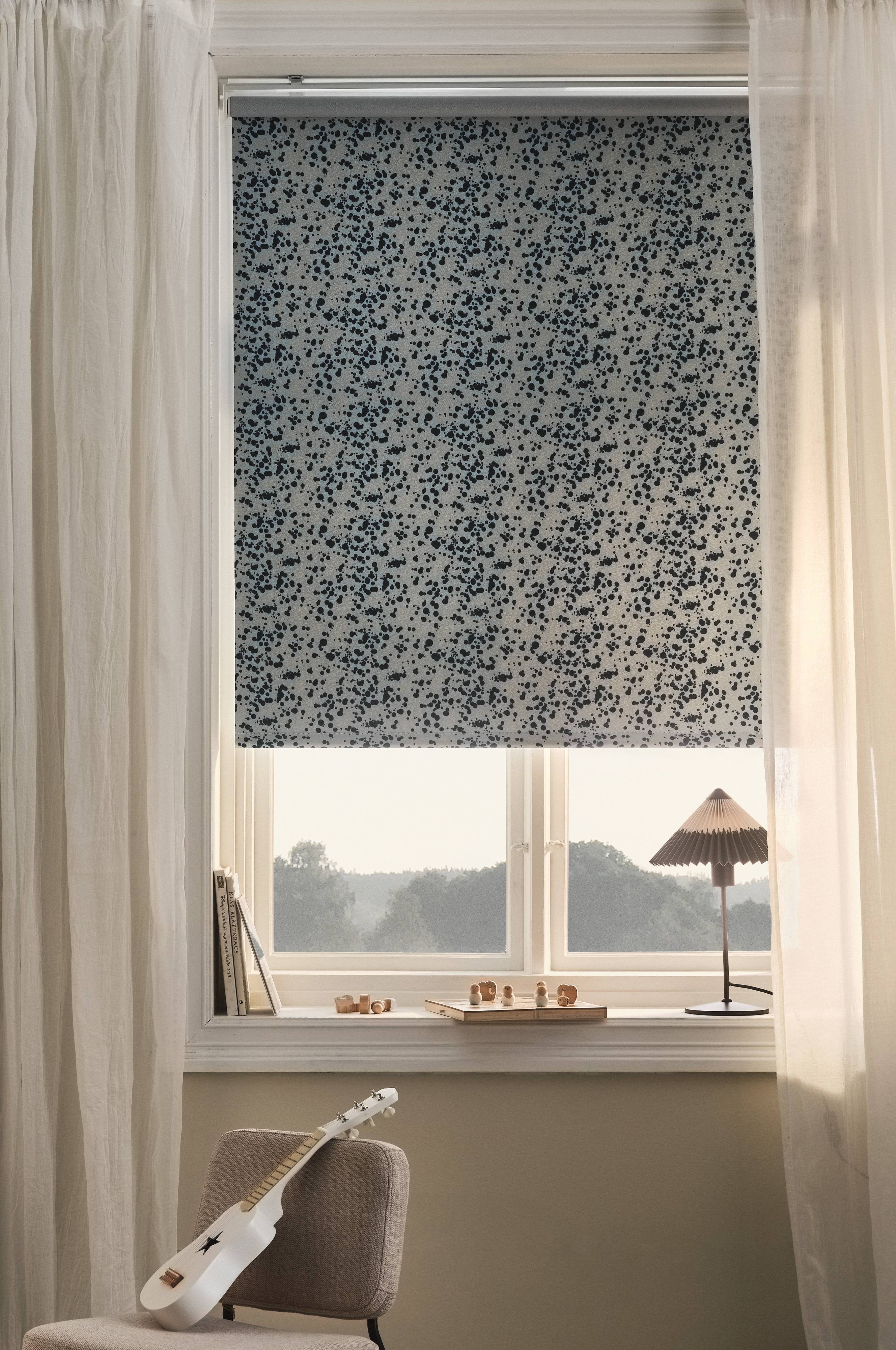LETICIA ist ein Verdunkelungsrollo aus Polyester, wobei die Hälfte aus Recyclingmaterial besteht. Mit diesem kräftigen Stoff kannst du Schlafzimmer, Fernsehraum oder Kinderzimmer völlig abdunkeln. Das Rollo wird oben mithilfe einer Metallbefestigung montiert. Unten ist ein runder Metallstab eingearbeitet. Damit dieses Rollo auch im Kinderzimmer angebracht werden kann, haben wir aus Sicherheitsgründen auf die Kugelkette verzichtet. Stattdessen wird das Rollo an der Unterkante gefasst und hoch- bzw. heruntergeschoben. Auf der dem Raum zugewandten Seite zeigt das Rollo ein effektvolles Pünktchenmuster auf hellem Untergrund; die Rückseite hat eine Verdunkelungsbeschichtung. Inklusive Befestigungselemente. Einfache Montage. Eine Montageanleitung ist beigepackt.