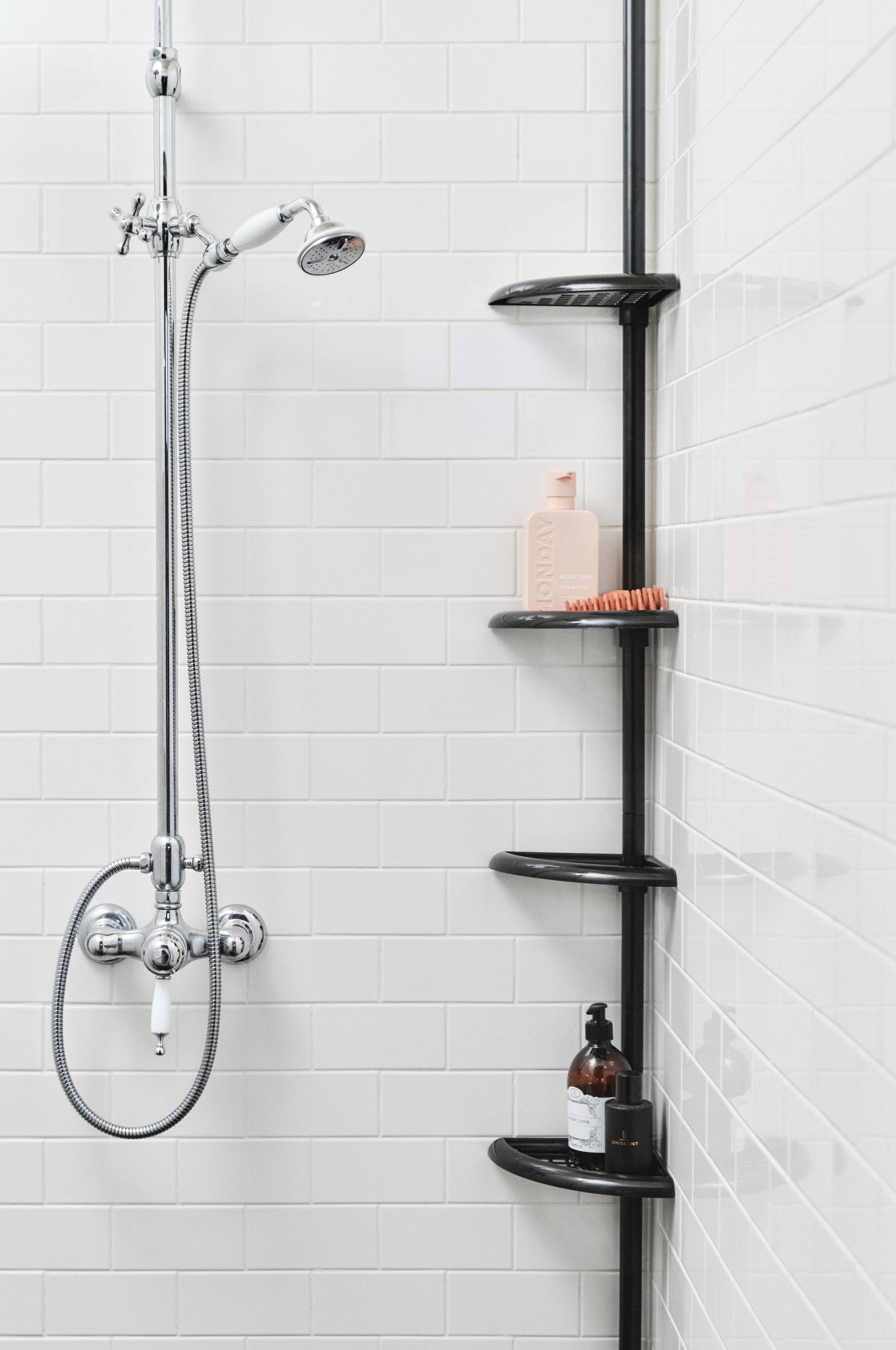 Eckregal aus Kunststoff mit Teleskopstange aus Metall. Das praktische Eckregal mit vier verstellbaren Ablageböden passt perfekt ins Badezimmer. Es lässt sich zwischen Badewannenrand und Decke oder auch zwischen Fußboden und Decke installieren. Dank der Teleskopstange ist die Höhe anpassbar und die Montage kinderleicht. Vier verstellbare Ablageböden lassen in Sachen Flexibilität keine Wünsche offen.