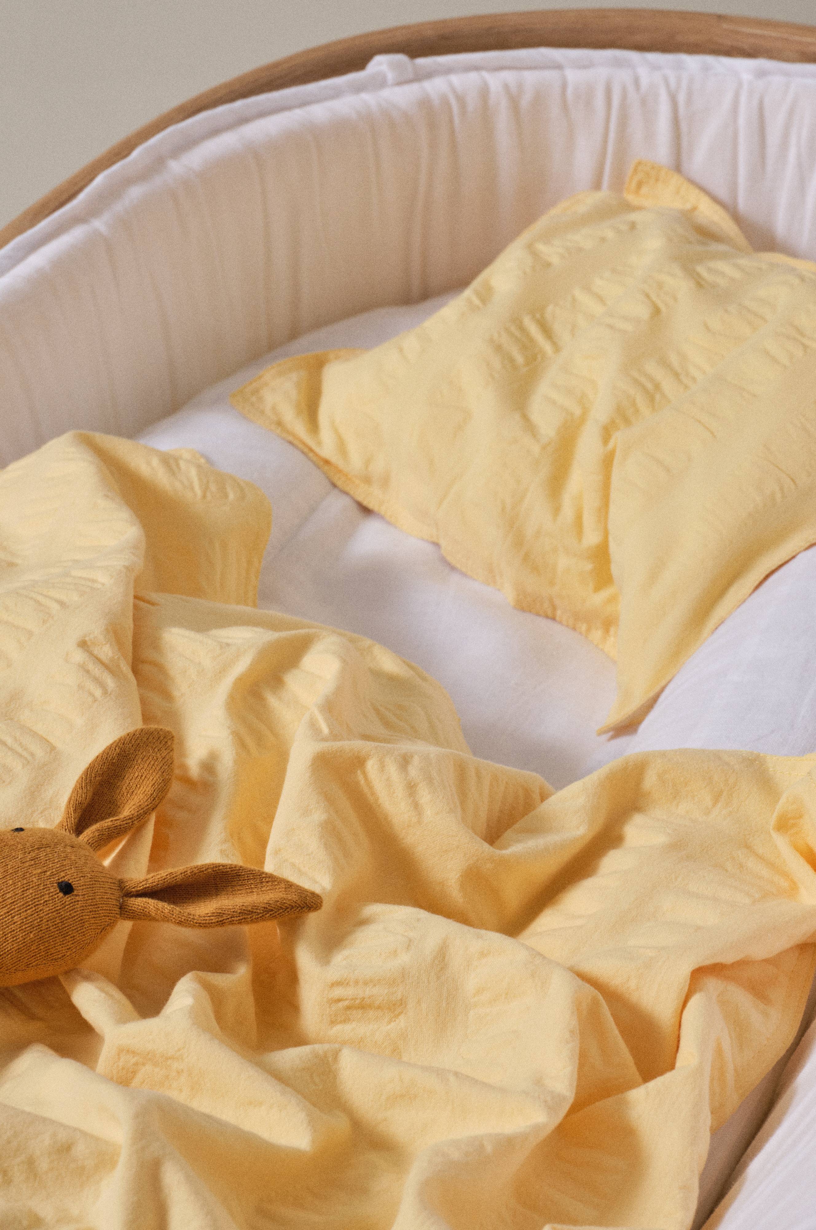Bettwäsche mit Bettbezug und Kopfkissenbezug aus schönem Seersucker aus zertifizierter Bio-Baumwolle. Das Set ist auf Kinderwagen und Wiegen abgestimmt. Der luftige Seersucker fühlt sich angenehm kühl an und ist herrlich atmungsaktiv. Bei unserer einfarbigen Serie LOLO wechselt sich glatter Webstoff mit Seersucker ab, was für eine hübsche Streifenoptik sorgt. Die garngefärbte, vorgewaschene Qualität besticht durch den weichen Griff. Fadendichte 120 TC. (Mit der Fadendichte bzw. dem TC-Wert (Thread Count) wird die Anzahl der Fäden in Kette und Schuss pro Quadratzoll angegeben. Je höher die Fadendichte, desto höher die Qualität.)