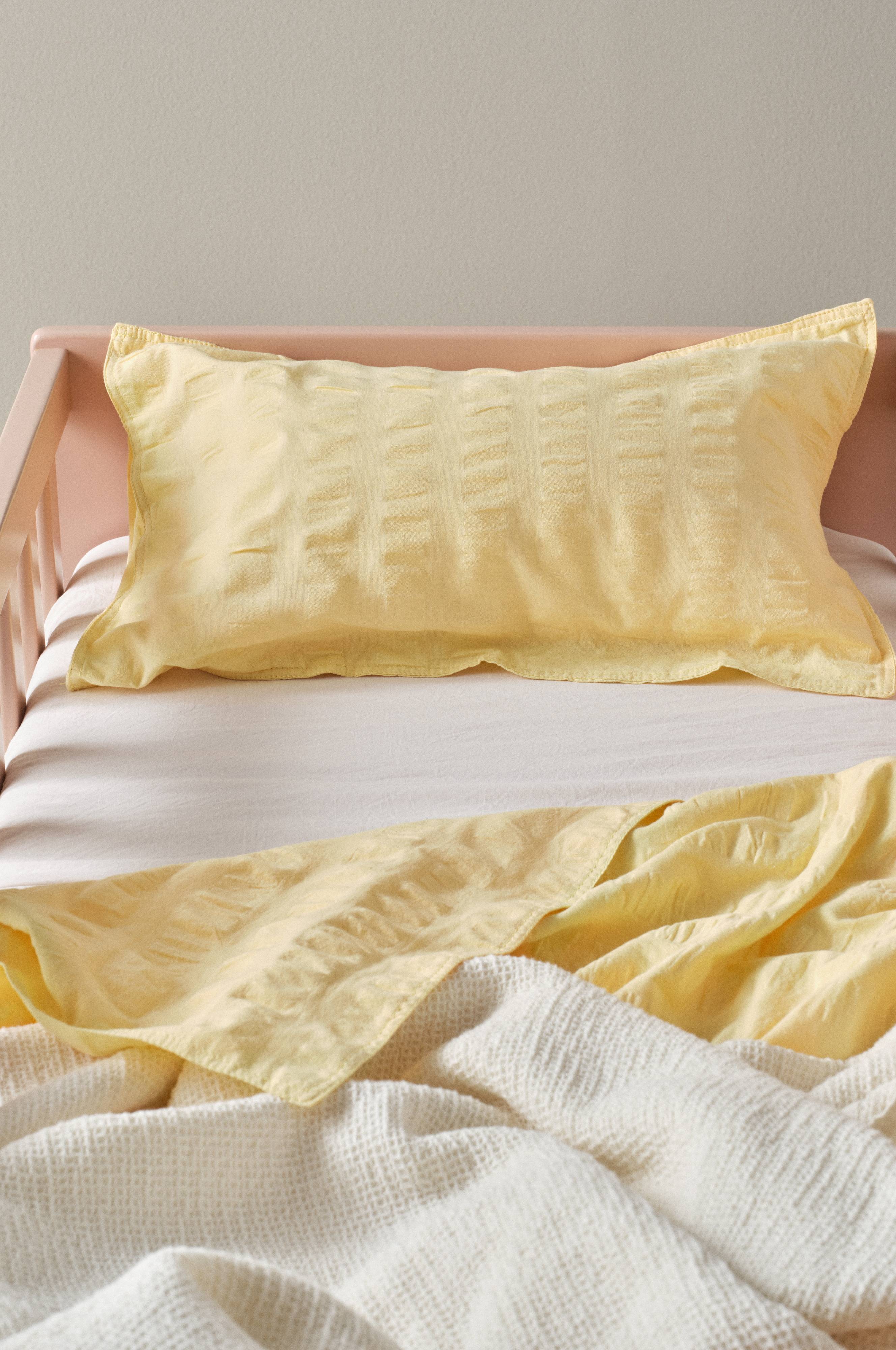 Behaglicher Seersucker-Kopfkissenbezug aus zertifizierter Bio-Baumwolle. Der luftige Seersucker fühlt sich angenehm kühl an und ist herrlich atmungsaktiv. Bei unserer einfarbigen Serie LOLO wechselt sich glatter Webstoff mit Seersucker ab, was für eine hübsche Streifenoptik sorgt. Die garngefärbte, vorgewaschene Qualität besticht durch den weichen Griff. Der kleine Kopfkissenbezug eignet sich für das Babybettchen. Fadendichte 120 TC. (Mit der Fadendichte bzw. dem TC-Wert (Thread Count) wird die Anzahl der Fäden in Kette und Schuss pro Quadratzoll angegeben. Je höher die Fadendichte, desto höher die Qualität.)