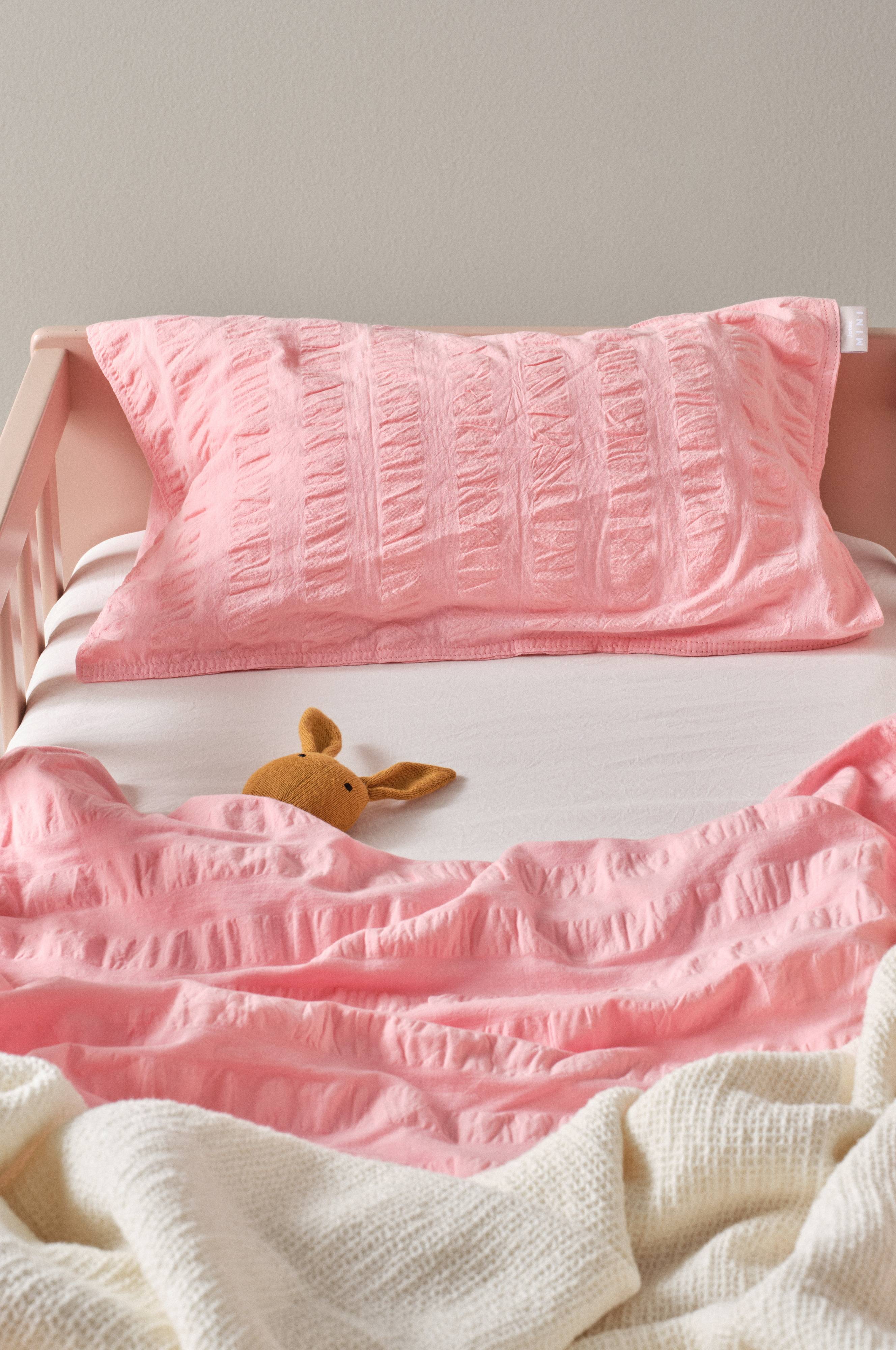 Behaglicher Seersucker-Kopfkissenbezug aus zertifizierter Bio-Baumwolle. Der luftige Seersucker fühlt sich angenehm kühl an und ist herrlich atmungsaktiv. Bei unserer einfarbigen Serie LOLO wechselt sich glatter Webstoff mit Seersucker ab, was für eine hübsche Streifenoptik sorgt. Die garngefärbte, vorgewaschene Qualität besticht durch den weichen Griff. Der kleine Kopfkissenbezug eignet sich für das Babybettchen. Fadendichte 120 TC. (Mit der Fadendichte bzw. dem TC-Wert (Thread Count) wird die Anzahl der Fäden in Kette und Schuss pro Quadratzoll angegeben. Je höher die Fadendichte, desto höher die Qualität.)