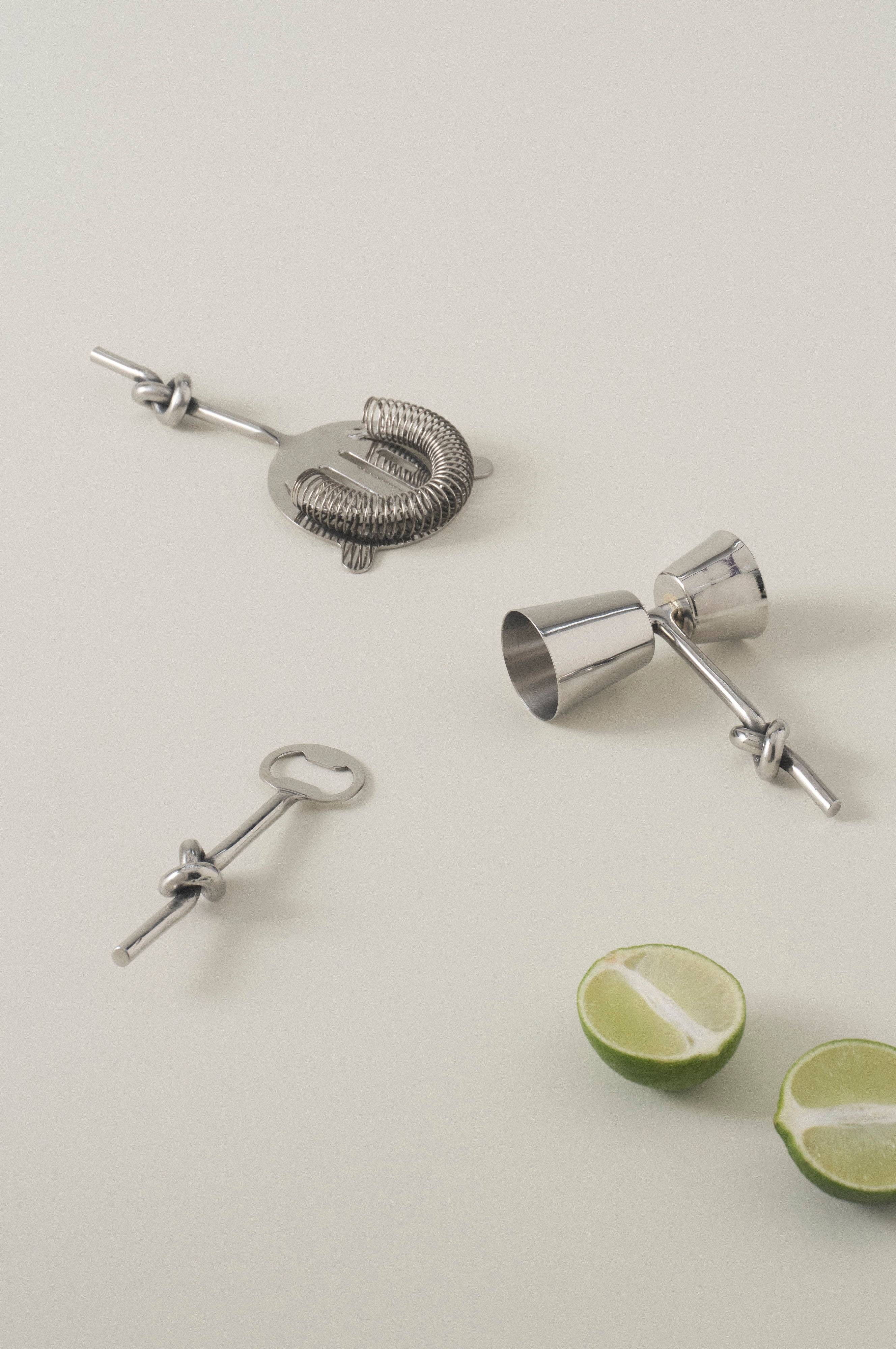 Dieses 3-teilige Cocktail-Set aus Edelstahl hat seinen großen Auftritt, wenn Gäste geladen sind. LOOP hat ein rustikales Design mit einem Knoten am Schaft. Das Set umfasst einen Flaschenöffner, ein Sieb und ein Messglas mit zwei Messbechern.
