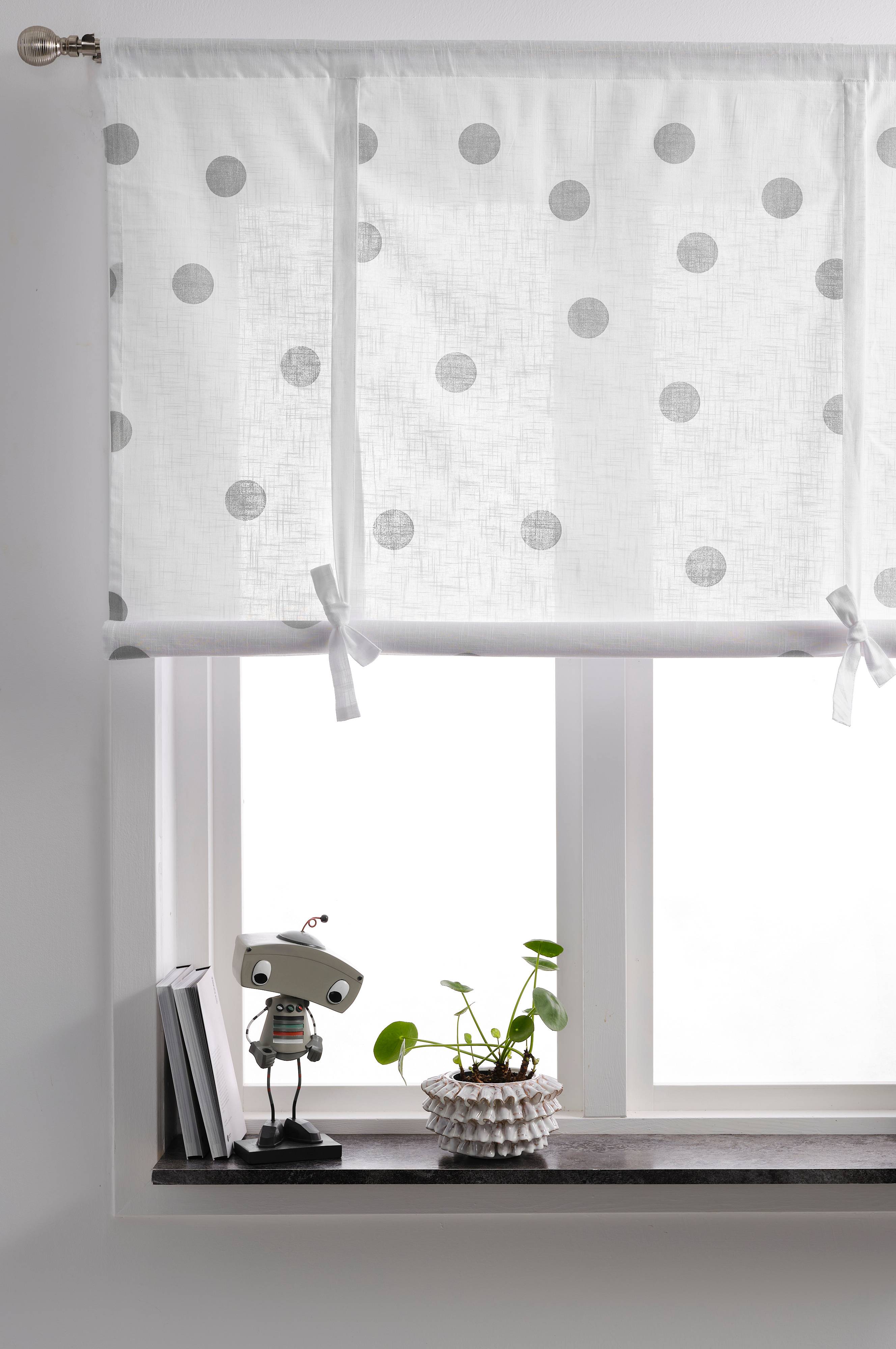 Rollgardine aus Baumwolle mit aufgedrucktem Punktemuster. Aufhängung auf einer normalen Gardinenstange. Per Bindeband verstellbare Höhe.