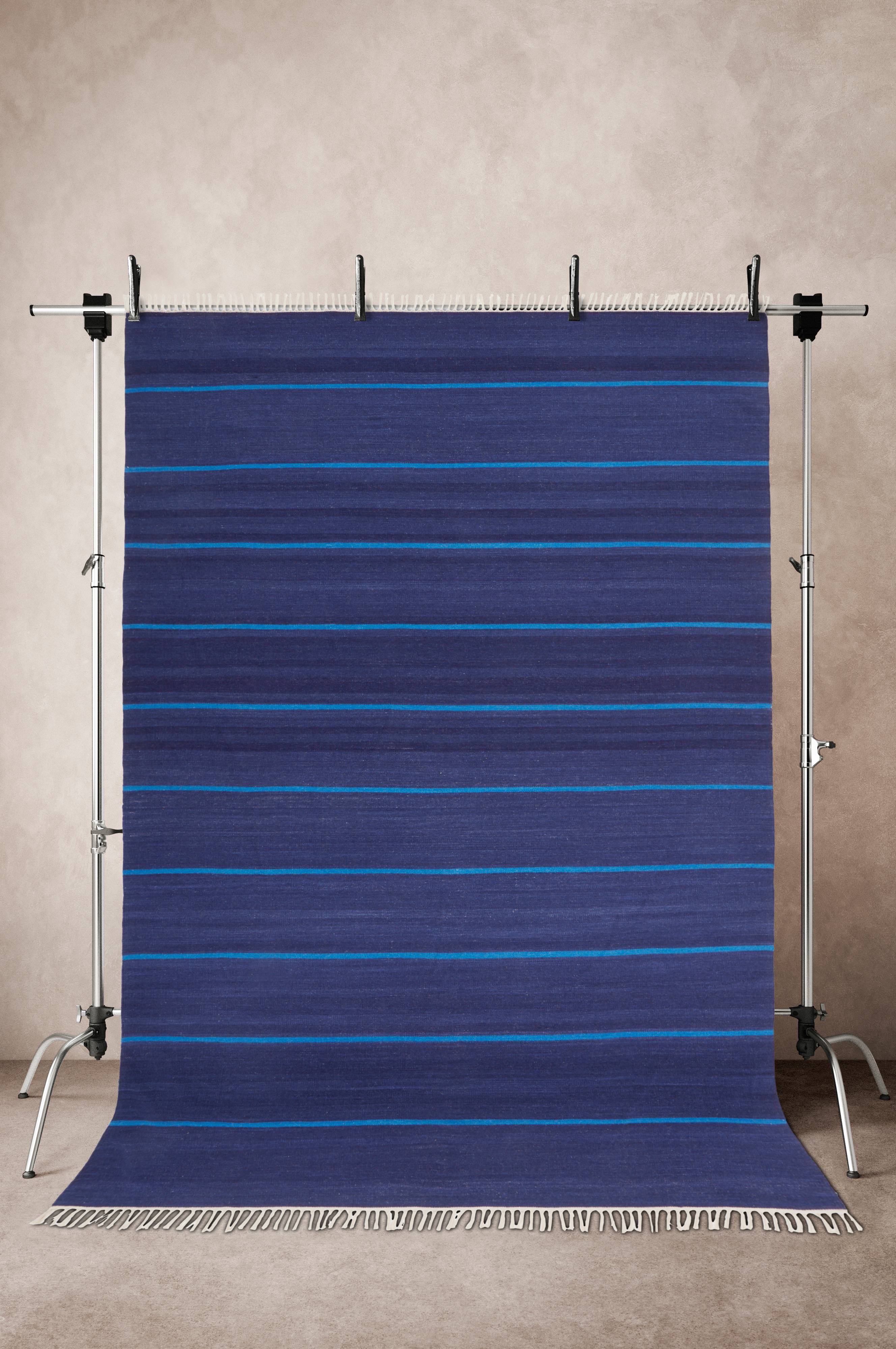 Handgewebter Wollteppich aus einer angenehmen, warmen Qualität mit Baumwollanteil. Die Serie LORI STRIPE bietet Wollteppiche mit Streifenmustern in kontrastierenden Farbtönen. Das Naturmaterial Wolle wärmt angenehm und empfiehlt sich daher besonders für alle Räume mit eher kalten Fußböden. Praktischerweise wirkt Wolle auch auf natürliche Weise schmutzabweisend. Alle Teppiche der LORI-Serie haben Fransen an den kurzen Seiten. Fransenlänge 8‒10 cm. Dicke 0,5 cm. 1000 g/m².