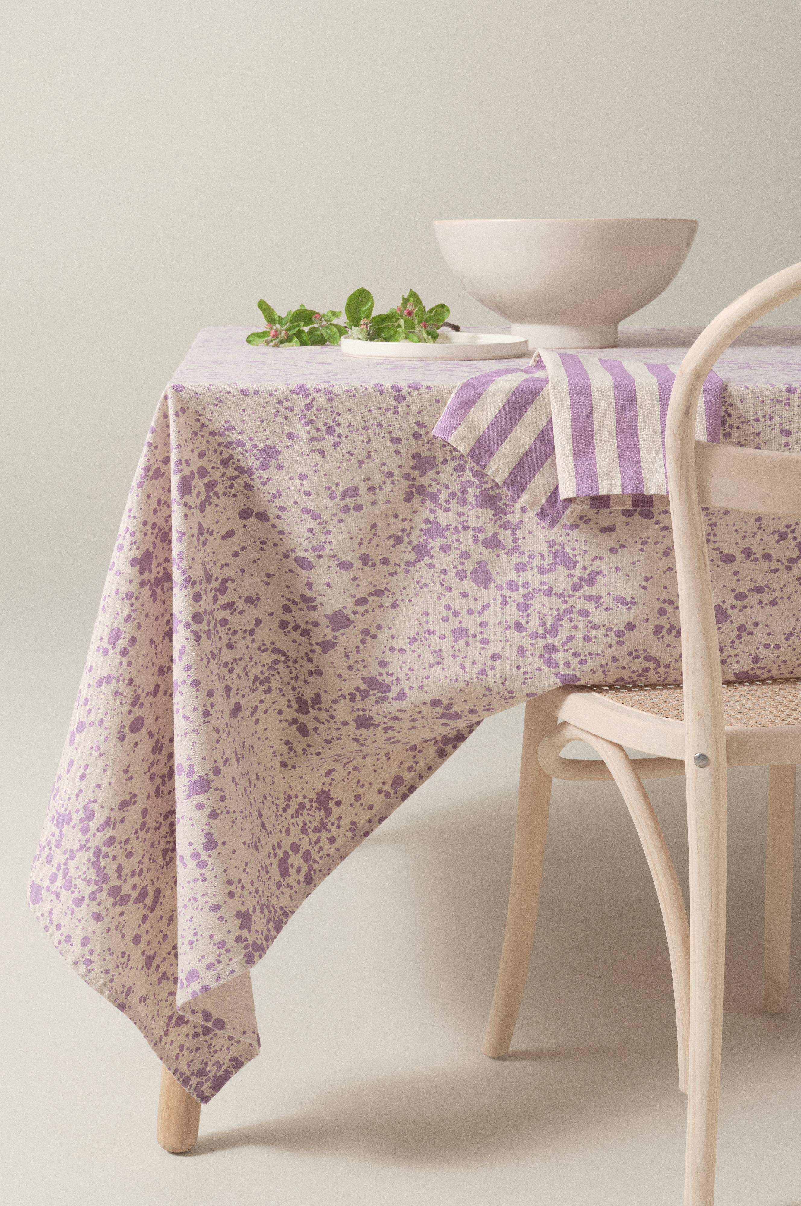 Tischdecke aus einem Baumwollmischgewebe mit Leinenanteil, der dem Stoff Festigkeit verleiht. Diese Tischdecke hat ein aufgedrucktes, lebhaftes Spritzmuster.