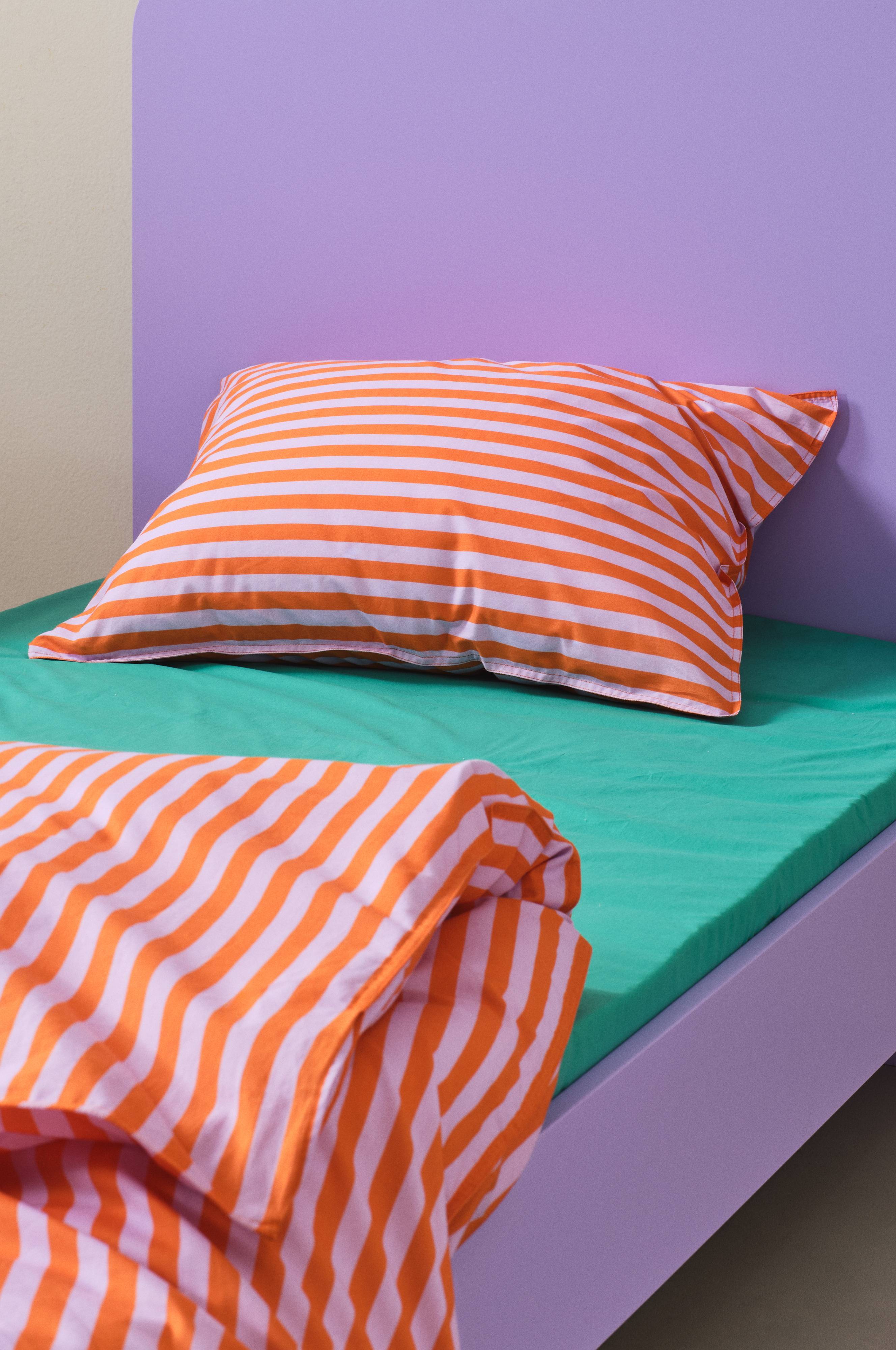Gestreifter Kopfkissenbezug aus Bio-Baumwolle. Bei unserer farbenfrohen Bettwäscheserie LOUSA sorgt der Digitaldruck für weichere und klarere Streifen mit höherer Farbtreue. In weicher, kühler Bio-Baumwolle schlummert es sich überaus angenehm. Fadendichte 180 TC. (Mit der Fadendichte bzw. dem TC-Wert (Thread Count) wird die Anzahl der Fäden in Kette und Schuss pro Quadratzoll angegeben. Je höher die Fadendichte, desto höher die Qualität. Eine Ausnahme bildet Leinen, denn hier möchte man oft durch etwas lockereres Weben die gewünschte Haptik erzielen.)