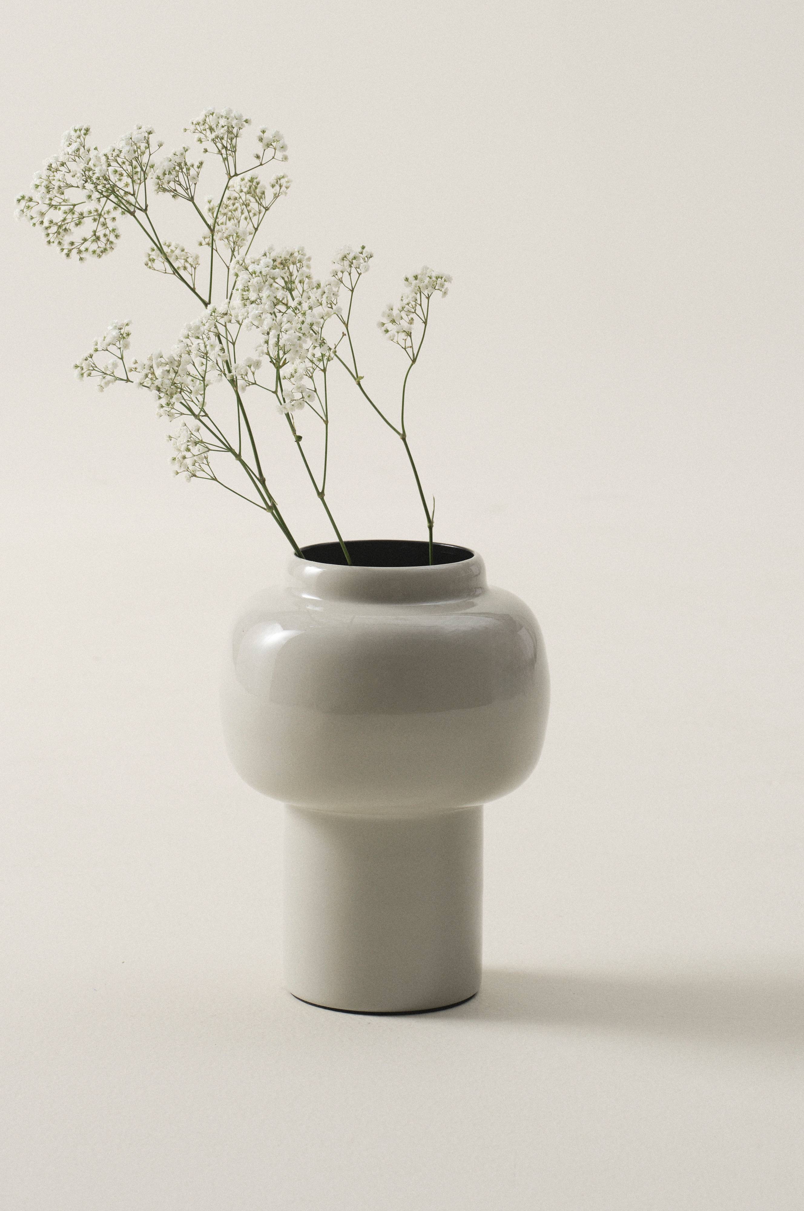 Ziervase aus Eisen mit einem Emaille-Finish, das der Farbe einen schönen Glanz und Tiefe verleiht. Formschönes, elegantes Modell. Mattschwarze Innenseite und mit Stoff bezogener Boden an der Außenseite. Die Vase verträgt Wasser; im Laufe der Zeit kann Wasser jedoch dazu führen, dass sie rostet.