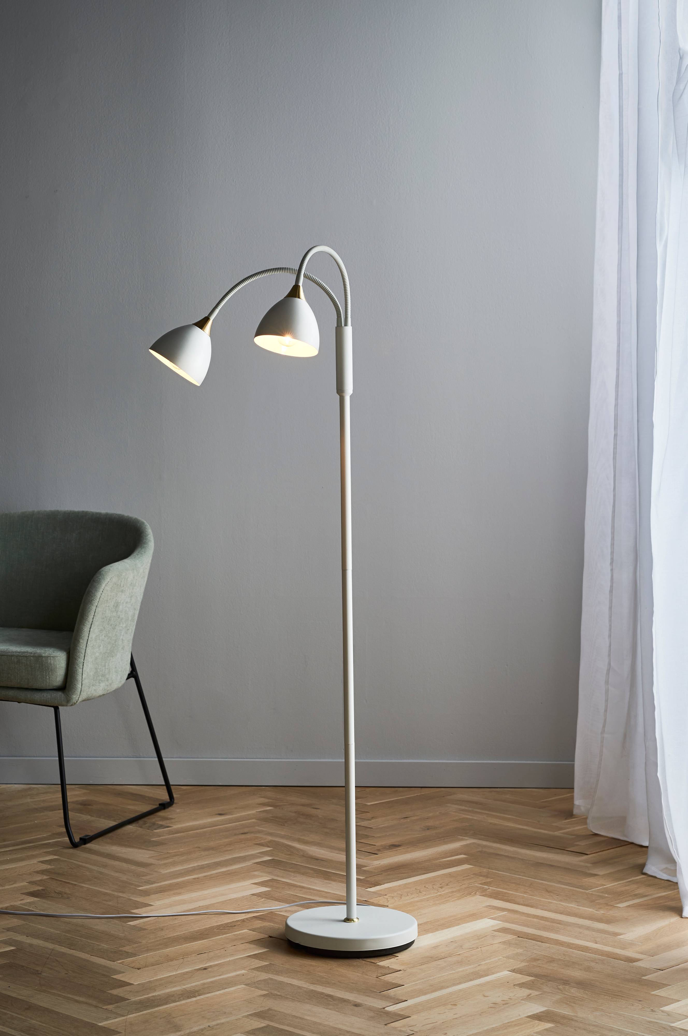 Eine zweiarmige Stehlampe, die Atmosphäre und zusätzliches Licht verbreitet - ideal als Leselampe neben Sessel oder Sofa.