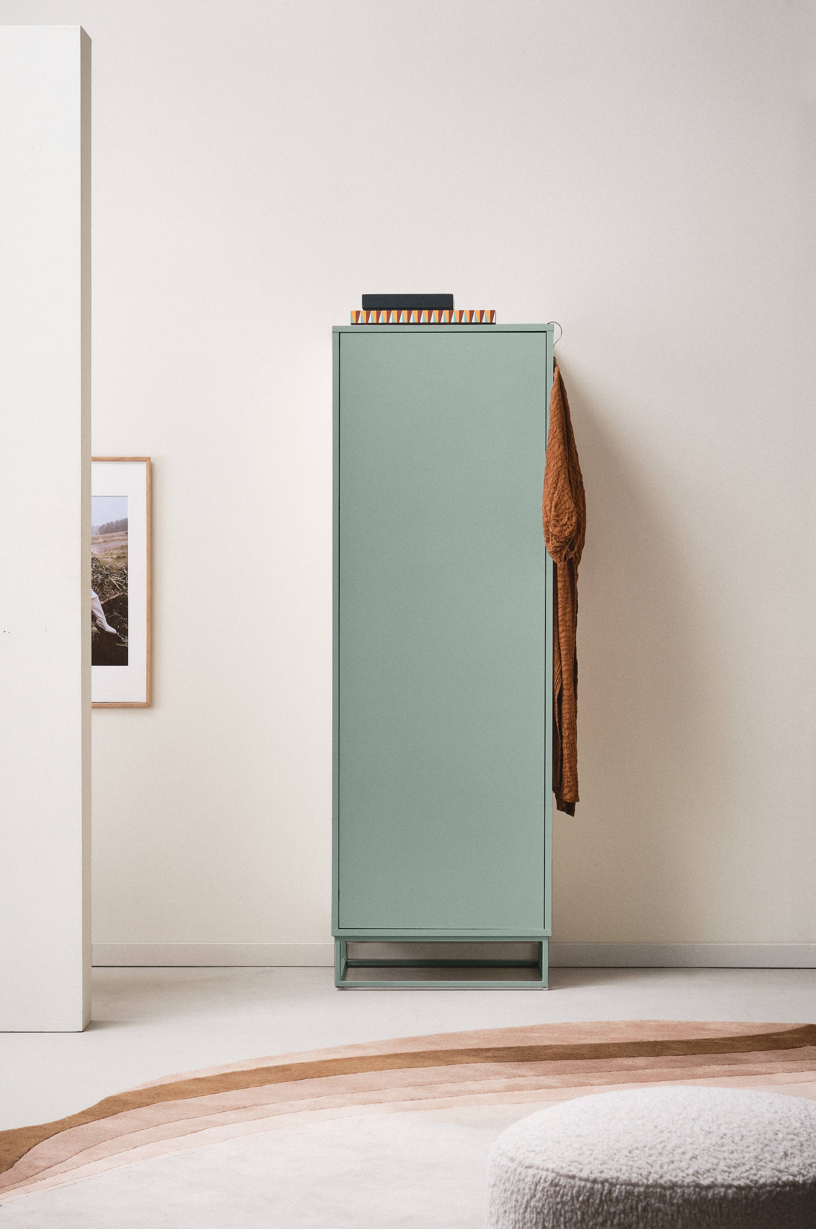 Kleiderschrank aus MDF, mit Untergestell aus Metall. Der minimalistische, schnörkellose Kleiderschrank hat eine Tür mit Push-to-open-Funktion. Auch wenn das Modell eine glatt gearbeitete Front ohne Griffe hat, lässt es sich doch mühelos öffnen. Ausgestattet ist der Schrank mit einer Kleiderstange aus massivem Buchenholz und mit einem festen Einlegeboden. Der Türanschlag ist links. Du kannst den Türanschlag auch selbst wechseln und nach rechts versetzen, allerdings verbleiben dann die Löcher auf der linken Seite. Die MDF-Komponenten haben ein Finish mit wasserbasiertem Lack erhalten. Der Sockel besteht aus pulverbeschichtetem Vierkantprofil. Durch die Wandbefestigung lässt sich der Schrank bei Bedarf in der Wand verankern. Einige Montageschritte sind erforderlich. Inklusive Montageanleitung.