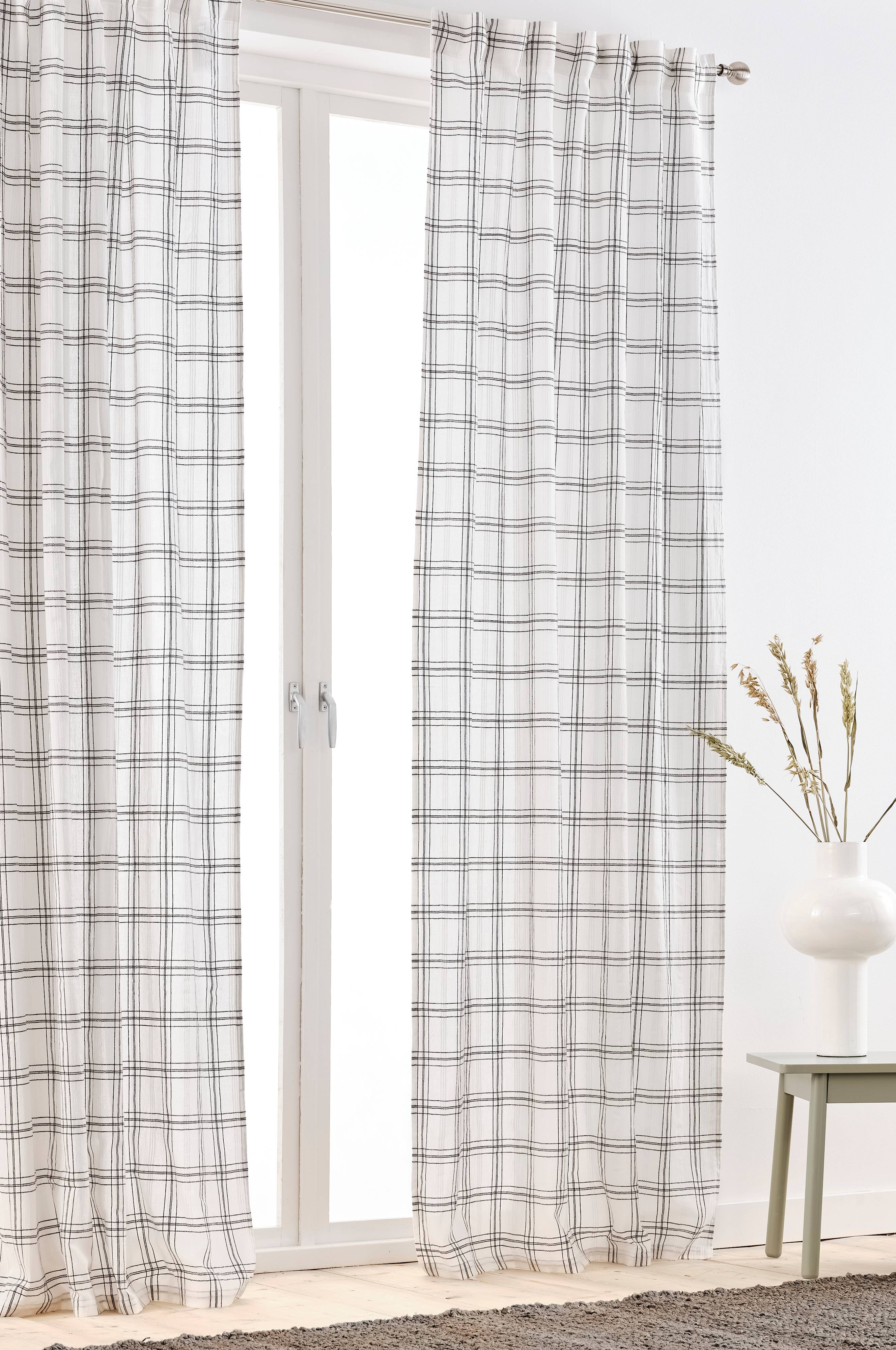 2 Gardinenschals aus Baumwolle mit aufgenähtem Multifunktionsband. Das klassische Karomuster der Gardine verleiht deinem Zuhause eine gemütliche Atmosphäre. Die Gardine kann mit Fingerhaken, Tunnel oder verdeckten Schlaufen aufgehängt werden.