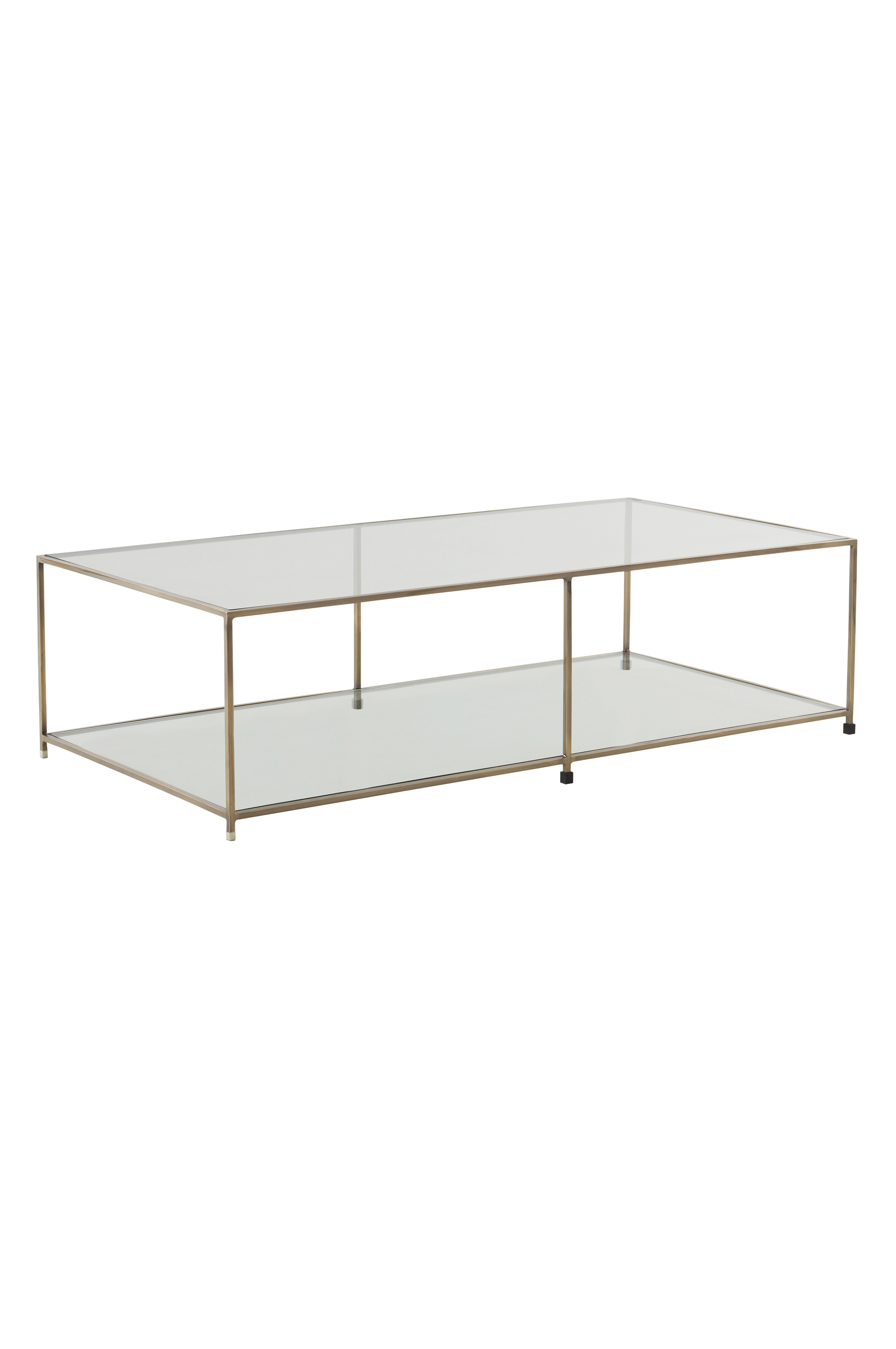 Rechteckiger Couchtisch aus Metall und Klarglas. Ein feines Metallgestell umrahmt die gläserne Tisch- und Ablageplatte und verleiht diesem Möbel seine Leichtigkeit.