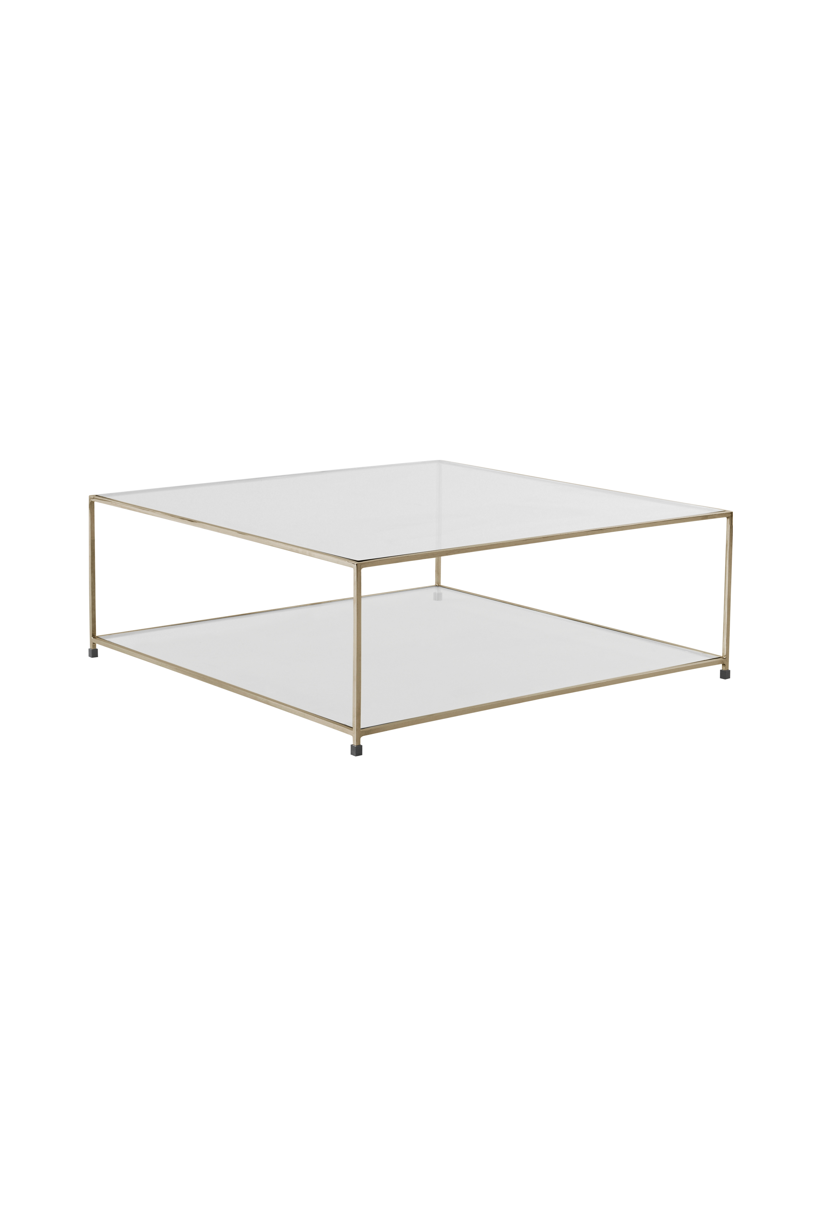 Quadratischer Couchtisch aus Metall und Glas. Ein feines Metallgestell umrahmt die gläserne Tisch- und Ablageplatte und verleiht diesem Möbel seine Leichtigkeit.