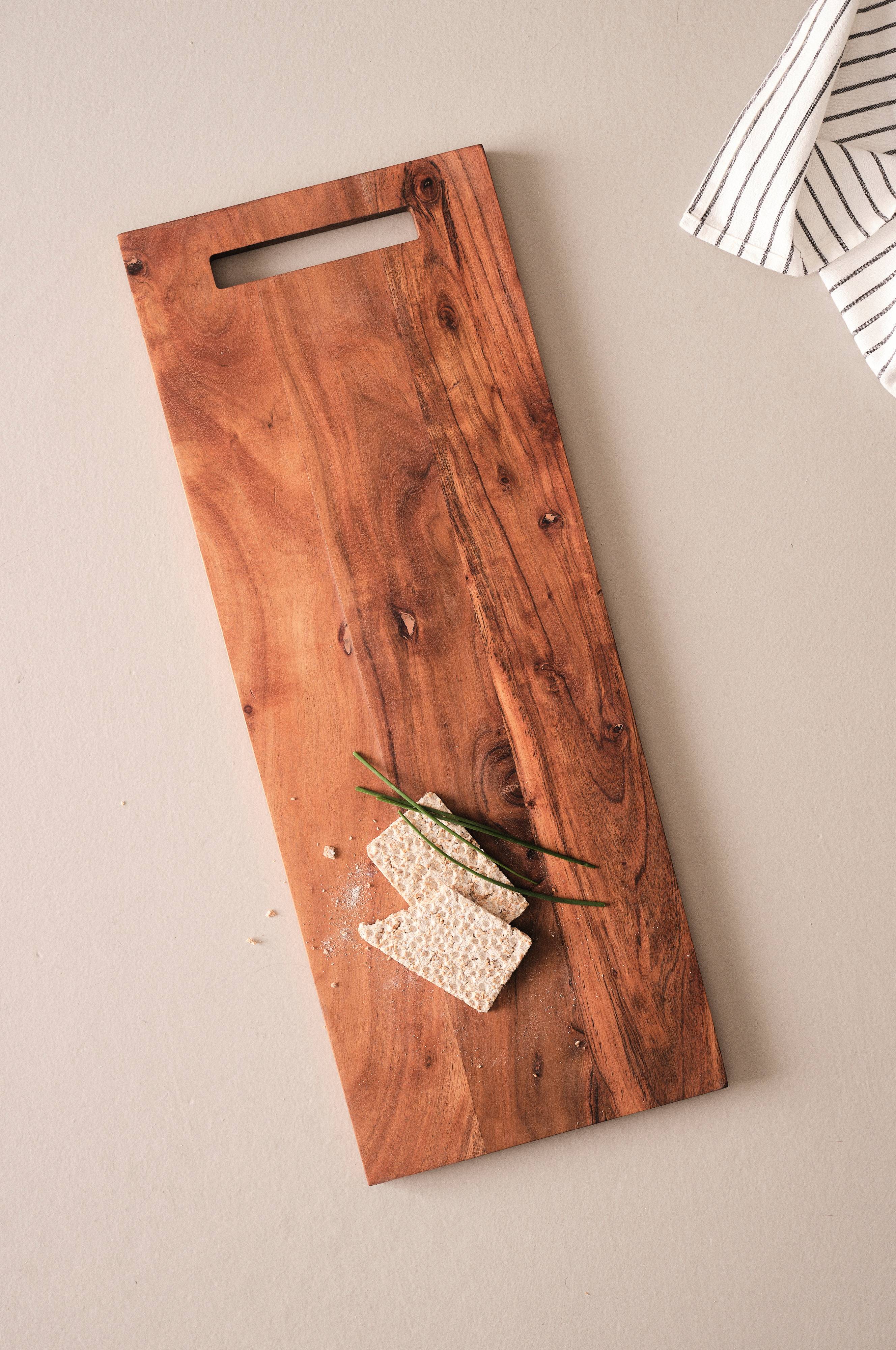 Handgearbeitetes Schneidebrett aus FSC-zertifizierter Akazie in natürlicher Farbe mit schöner Maserung. Mit seiner eleganten, rechteckigen Form eignet sich AMBRA auch hervorragend zum Anrichten und Servieren. An einem Ende befindet sich ein praktischer, ausgeschnittener Griff. Die weiche Oberfläche wurde mit pflanzlichem Öl behandelt. Aufgrund der natürlichen Maserung des Holzes und der manuellen Fertigung ist jedes Schneidebrett ein Unikat.