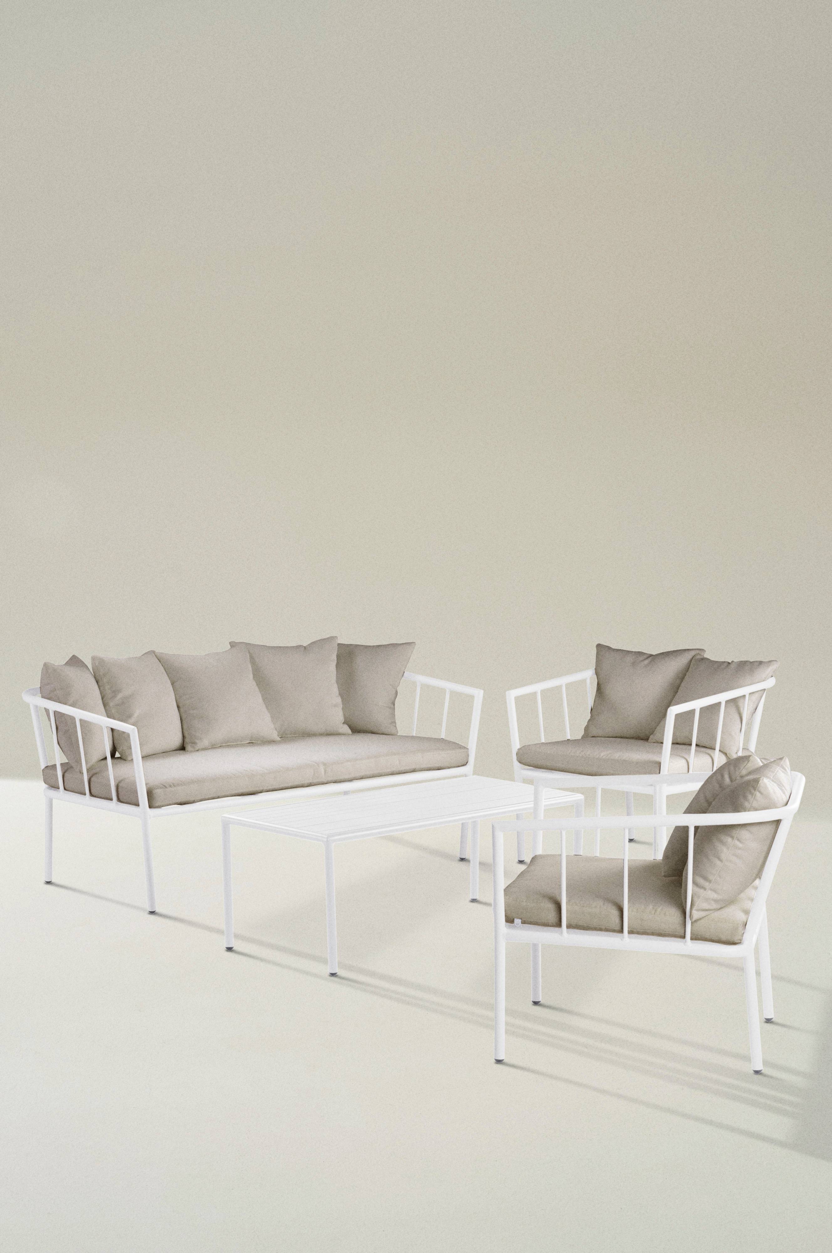 Bei diesem 4-teiligen Set mit Lounge-Möbeln aus pulverbeschichtetem Aluminium verhindert das matte Finish eine Reflektion des Sonnenlichts. Zum Set gehören zwei Sessel mit jeweils einem Sitzpolster und zwei Kissen, ein Sofa mit Sitzpolster und fünf Kissen sowie ein Couchtisch. Sitzpolster mit Polyesterbezug und Schaumstofffüllung. Dank des rostfreien Aluminiums ist MENTON wetterbeständig und kann problemlos draußen stehenbleiben. So praktisch, wenn man nicht immer alles hin- und hertragen muss! Das ansprechende Design sorgt für die perfekte Lounge-Atmosphäre. Zur Aufbewahrung lässt sich MENTON mühelos stapeln. Geringes Gewicht.