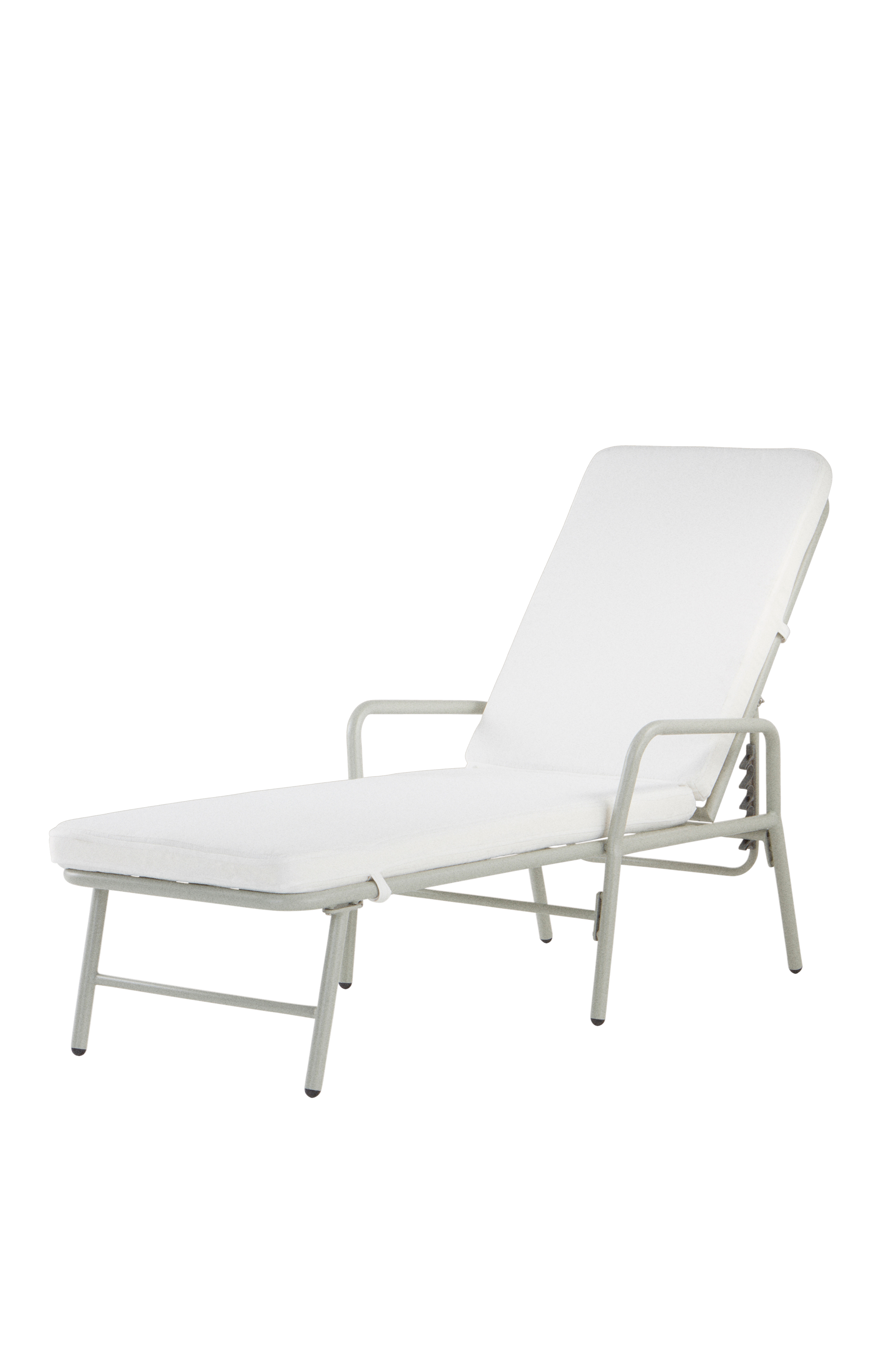 Sonnenliege aus pulverbeschichtetem Aluminium mit einer matten Oberfläche, die in der Sonne nicht blendet. Die Rückenlehne ist in vier festen Positionen verstellbar. Kissen mit Polyesterbezug und Schaumstoffpolsterung. Der Bezug ist abnehmbar und hat einen Reißverschluss. MENTON kann im Freien stehen, Aluminium rostet nicht. Die Sonnenliege ist leicht und kompakt.