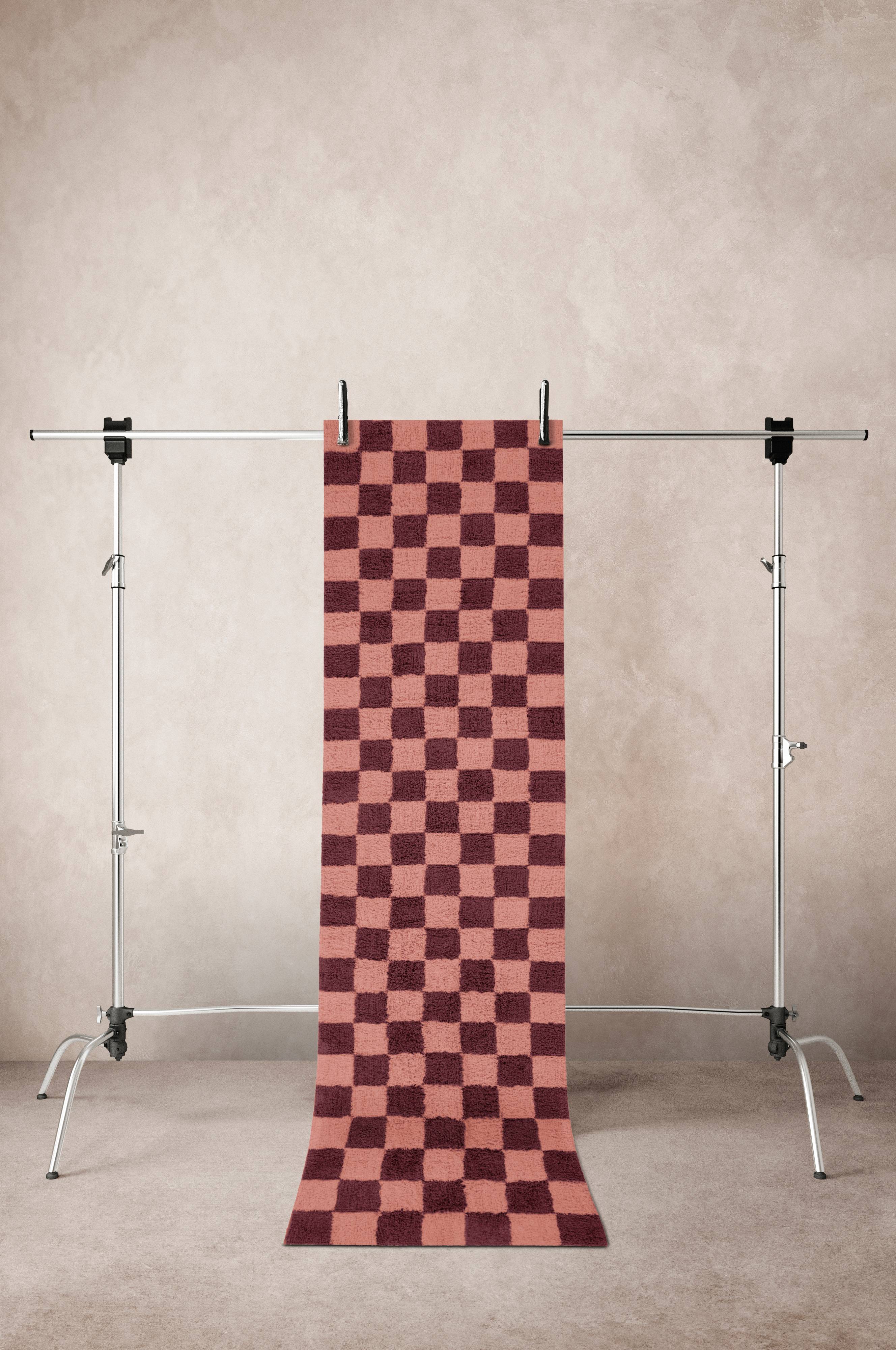 Teppich aus Bio-Baumwolle. Dieser schöne Teppich hat einen weichen Flor mit garngefärbten Quadraten und eine gewebte, naturfarbige Einfassung. Florhöhe 1-1,5 cm. Dicke 2 cm. 1300 g/m².