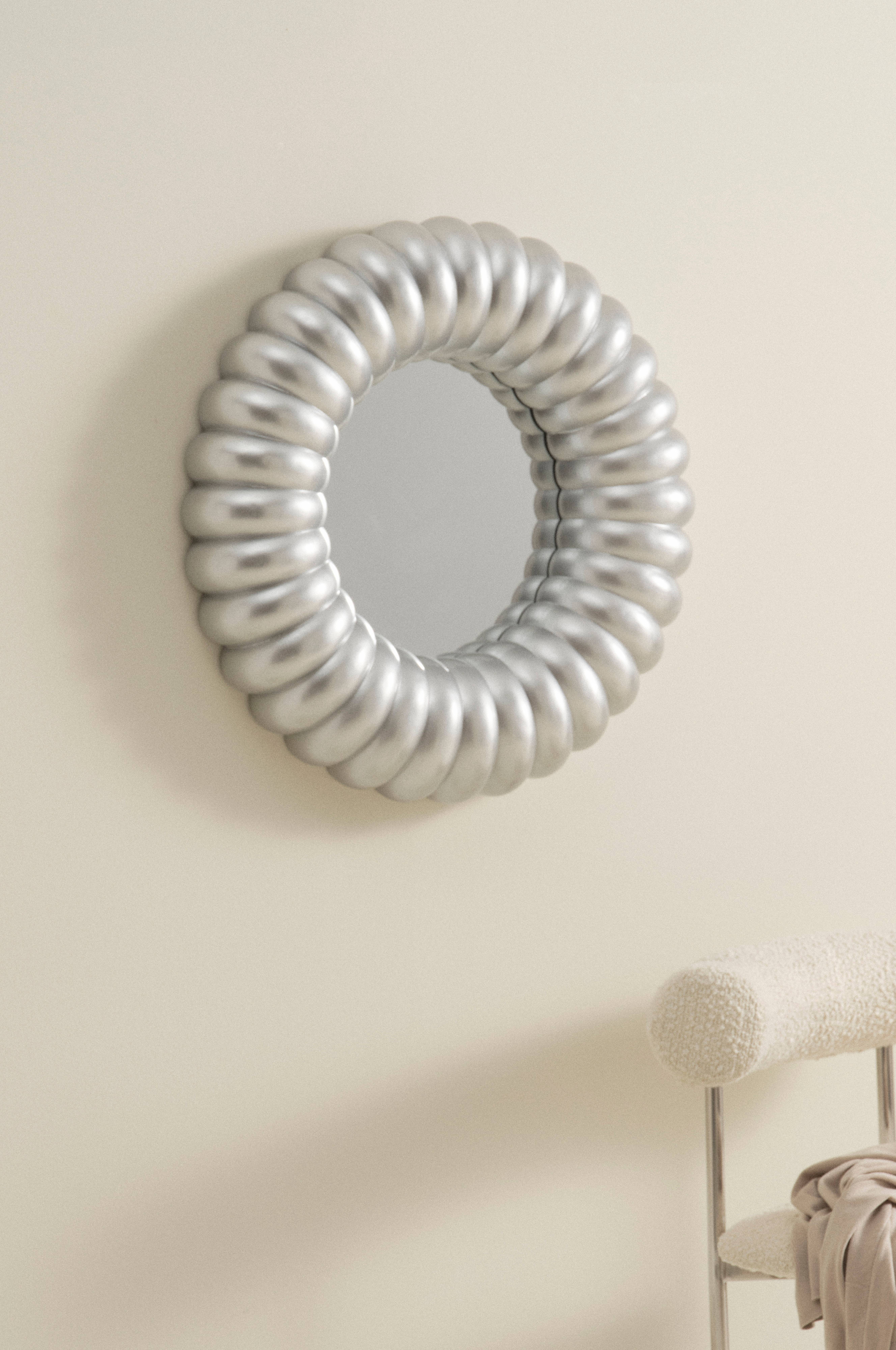 Ein runder Spiegel mit einem dreidimensionalen, silberfarben lackierten Rahmen aus Polyresin, der von Hand zusammengesetzt wurde. MIRAGE ist mehr als ein Spiegel, er ist ein Kunstwerk an der Wand. MIRAGE passt zu den verschiedensten Stilen und kann im Gästezimmer romantisch wirken, im Jugendzimmer cool und im Flur lustig.