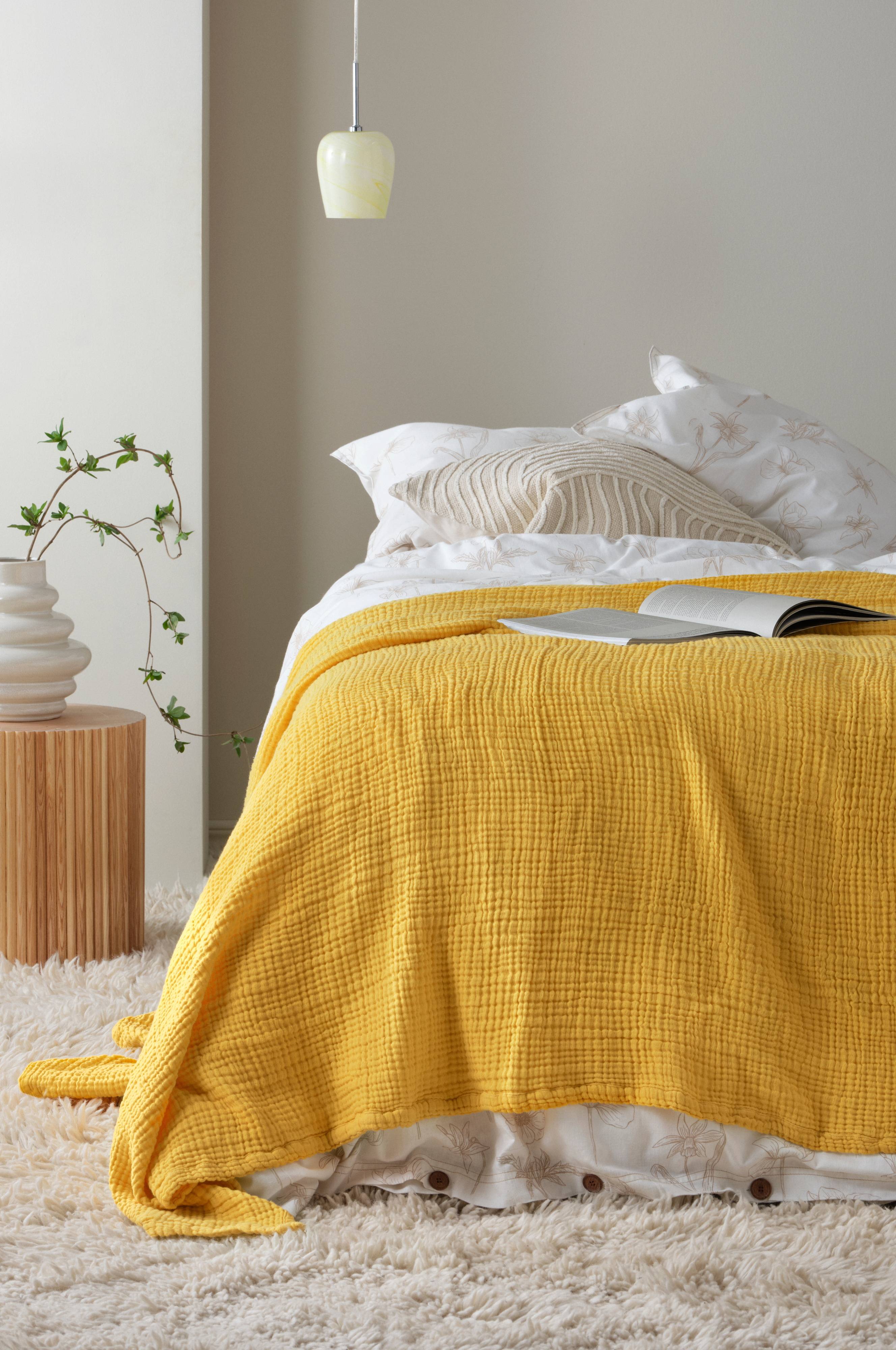 Tagesdecke für Einzelbetten. Diese Tagesdecke besteht aus edlem Baumwollmusselin .Die herrliche, dicke Musselinqualität ist garngefärbt und steingewaschen, was für einen besonders weichen Griff sorgt. Die umlaufende Steppnaht erzeugt eine schöne, 2 cm breite Kante. Gewicht 180 g/m².