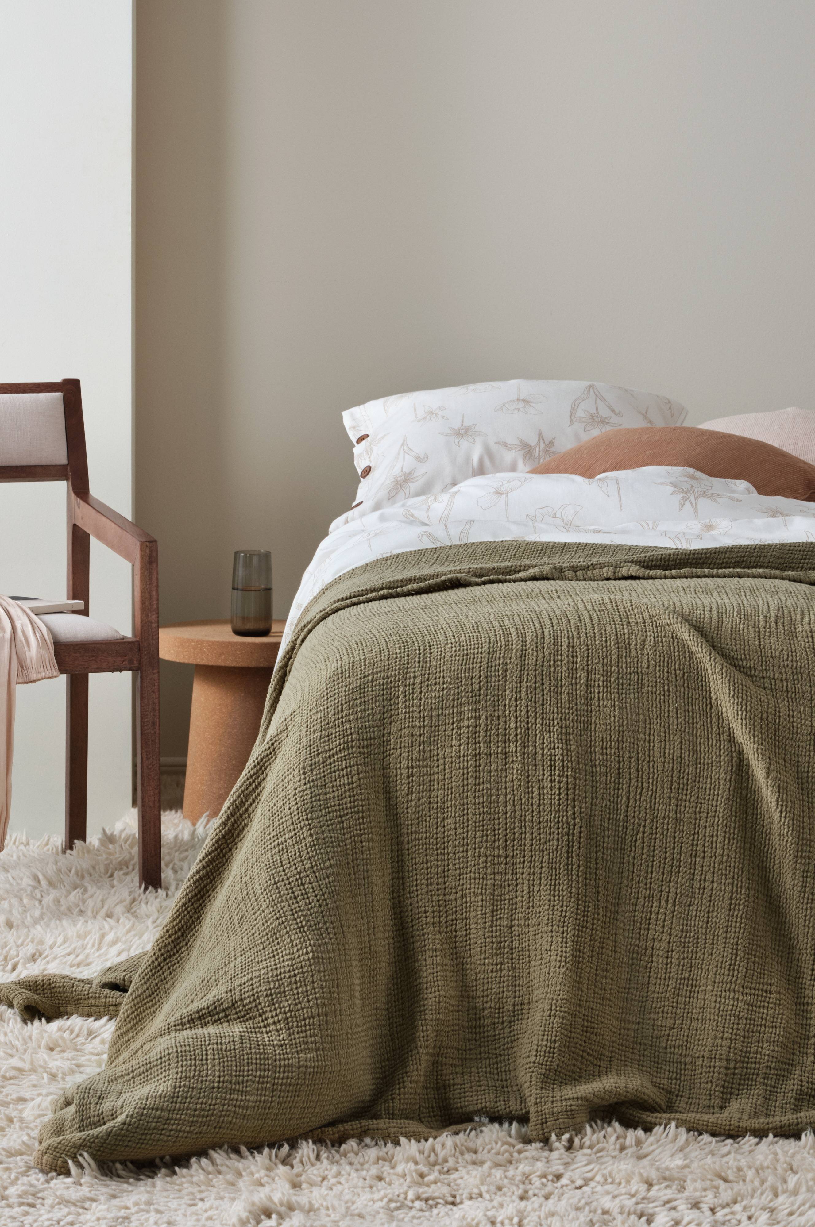 Tagesdecke für Einzelbetten. Diese Tagesdecke besteht aus edlem Baumwollmusselin .Die herrliche, dicke Musselinqualität ist garngefärbt und steingewaschen, was für einen besonders weichen Griff sorgt. Die umlaufende Steppnaht erzeugt eine schöne, 2 cm breite Kante. Gewicht 180 g/m².