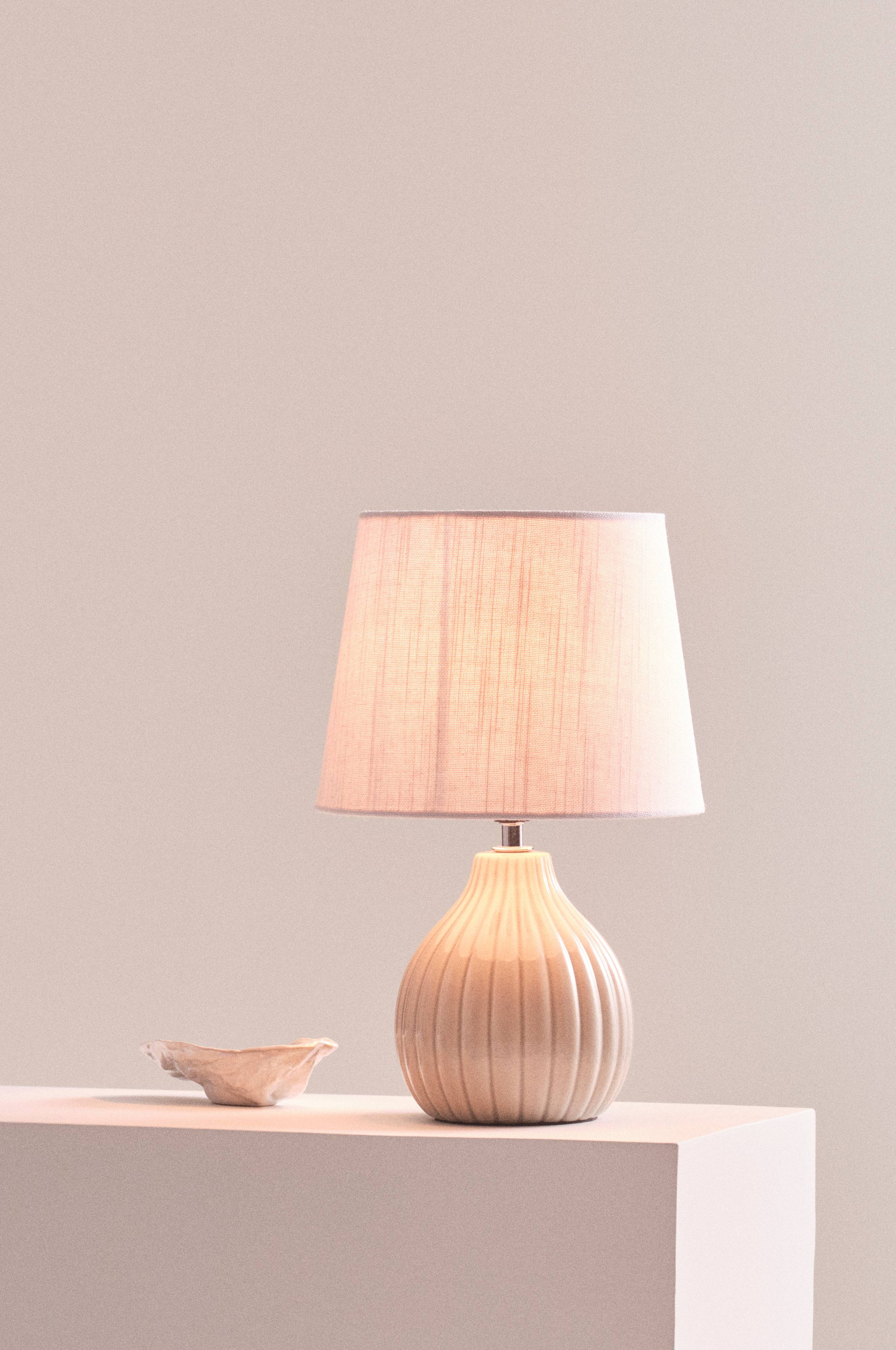 Tischleuchte mit Keramikfuß und Schirm aus Leinen. Der in sanften Rundungen gestaltete Fuß besitzt senkrechte Reliefstreifen und eine schöne Glasur. Der glatte Leinenschirm verleiht der Leuchte eine elegante Erscheinung. Der Schirm hat ein Metallgestell.