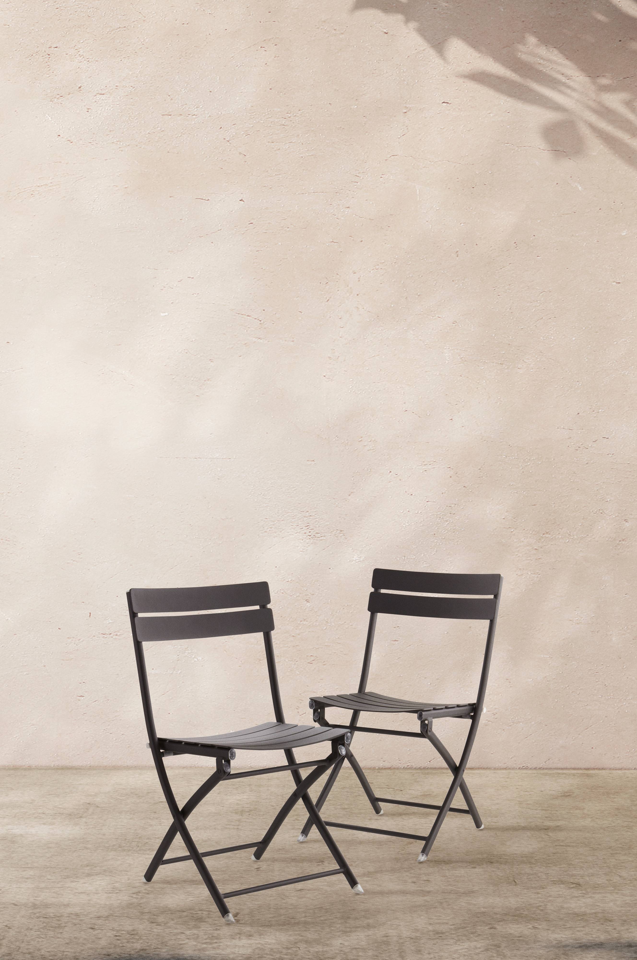 2er-Pack Stühle aus pulverbeschichtetem, mattiertem Aluminium. Praktische Klappstühle, die Gartenromantik ausstrahlen - ideal für kleine Balkone, Veranden und Winteraufbewahrung. MONTMARTRE kann draußen stehen bleiben, denn Aluminium rostet nicht. Geringes Gewicht.