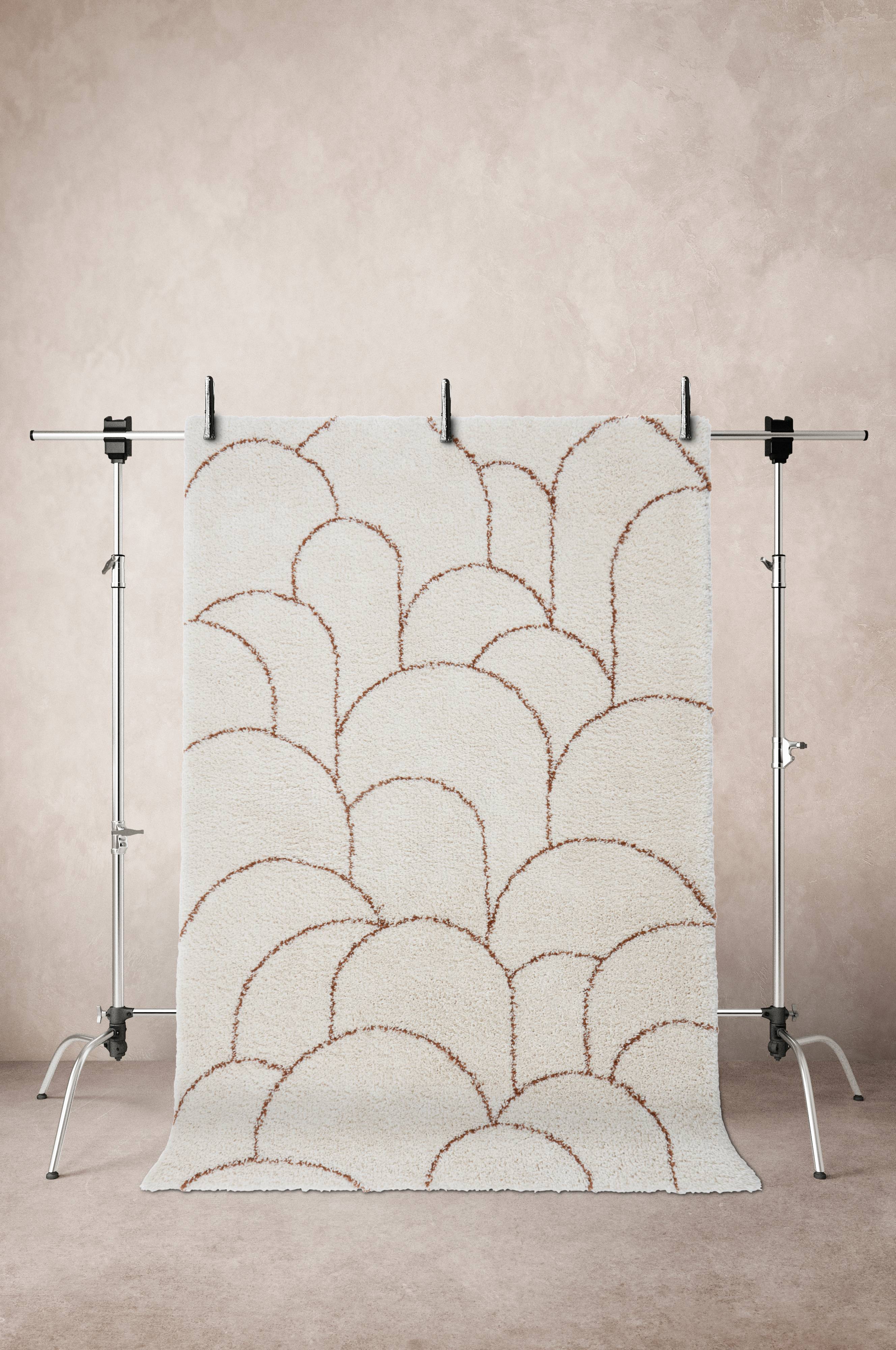 Florteppich mit schönem braunem Bogenmuster auf hellem Grund. Der Teppich hat einen dichten, langen und behaglichen Flor aus einem weichen Garn. Florhöhe 3,5 cm. Dicke 3,8 cm. 2400 g/m².