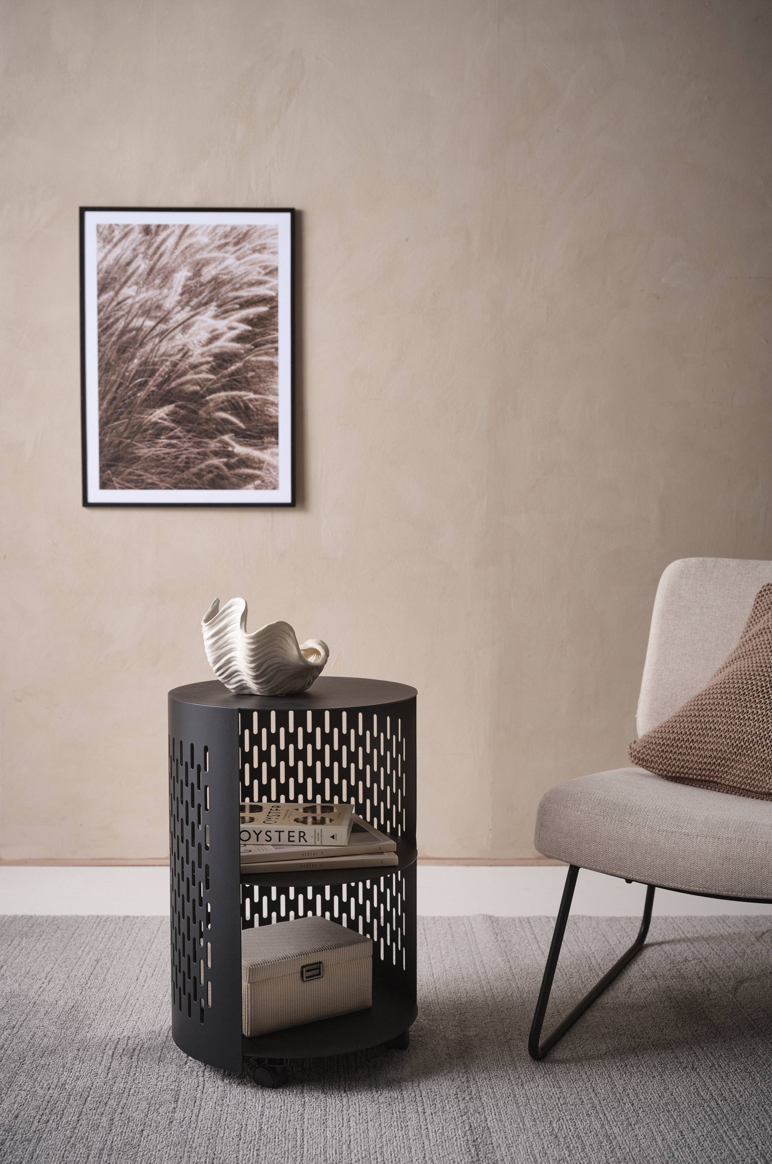 Dieser runde Beistelltisch aus pulverbeschichtetem Metall mit perforiertem Muster besticht durch schlankes Design und hochwertige Optik. Zwei der vier Rollen sind arretierbar. Im Sommer halten wir uns gerne im Freien auf und schätzen langlebige Möbel, denen der Regen nichts anhaben kann. Für den Innen- und Außengebrauch.