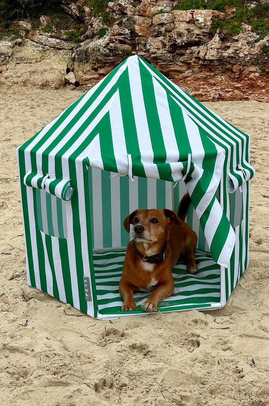 Sechseckiges, gestreiftes Tierzelt aus wasserabweisendem Polyester, mit Zeltstäben aus Kunststoff. Dieses Zelt bietet dem Vierbeiner ein schattiges, trockenes und windgeschütztes Ruheplätzchen im Garten oder auf dem Balkon. Wenn es zu warm werden sollte, kann die Luft durch die Öffnungen in den Zeltwänden frei zirkulieren. Das Dessin wird per Digitaldruck aufgebracht, was für klare Farben sorgt. Auch im Innenbereich kann das Zelt genutzt werden. Wenn es nicht verwendet wird, sollte das Zelt nicht draußen stehen bleiben. Bei Wind kann es empfehlenswert sein, es im Boden zu verankern.