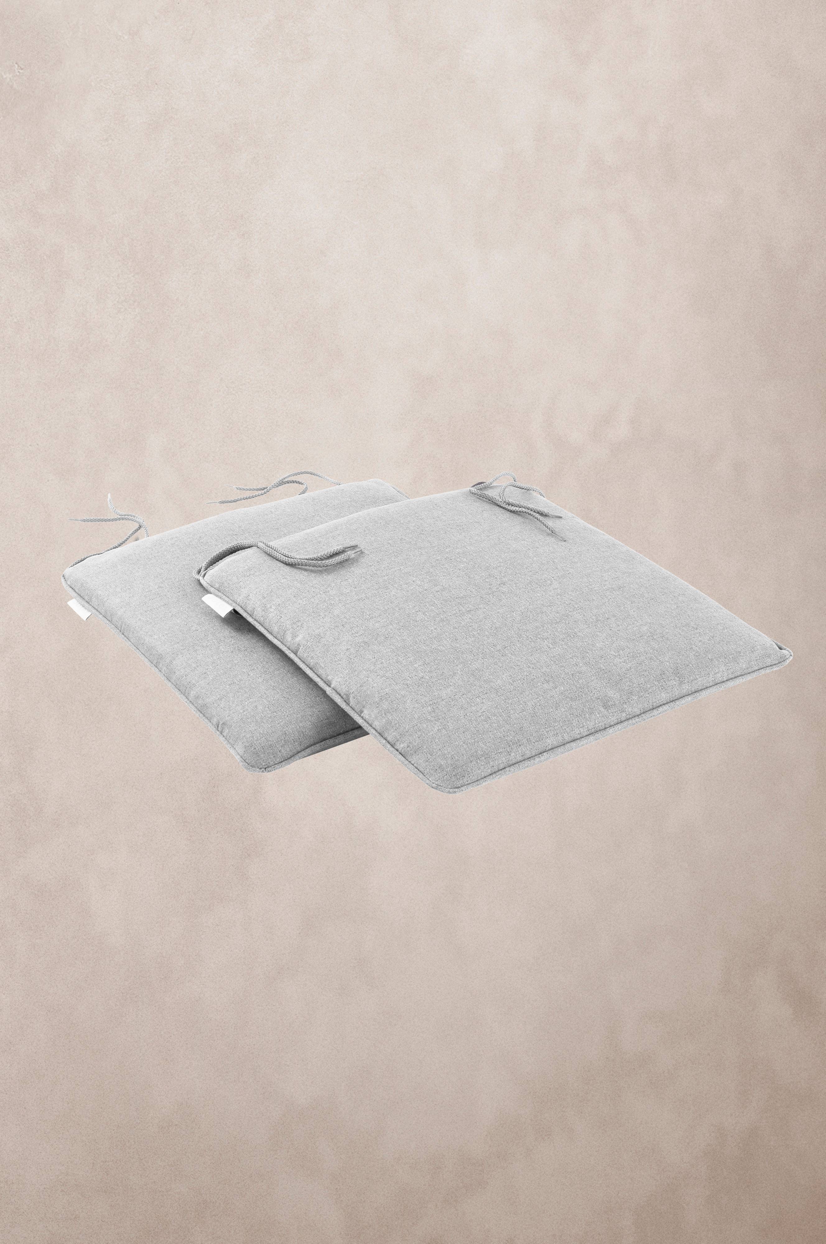 2er-Pack Sitzkissen für Outdoor-Möbel. Das Kissen ist mit Baumwolle, Polyester und recycelten Fasern gepolstert und mit Schaumstoff gefüllt. Der Bezug ist abnehmbar und hat einen Reißverschluss. Die Kissen passen auf den NERJA Sessel.