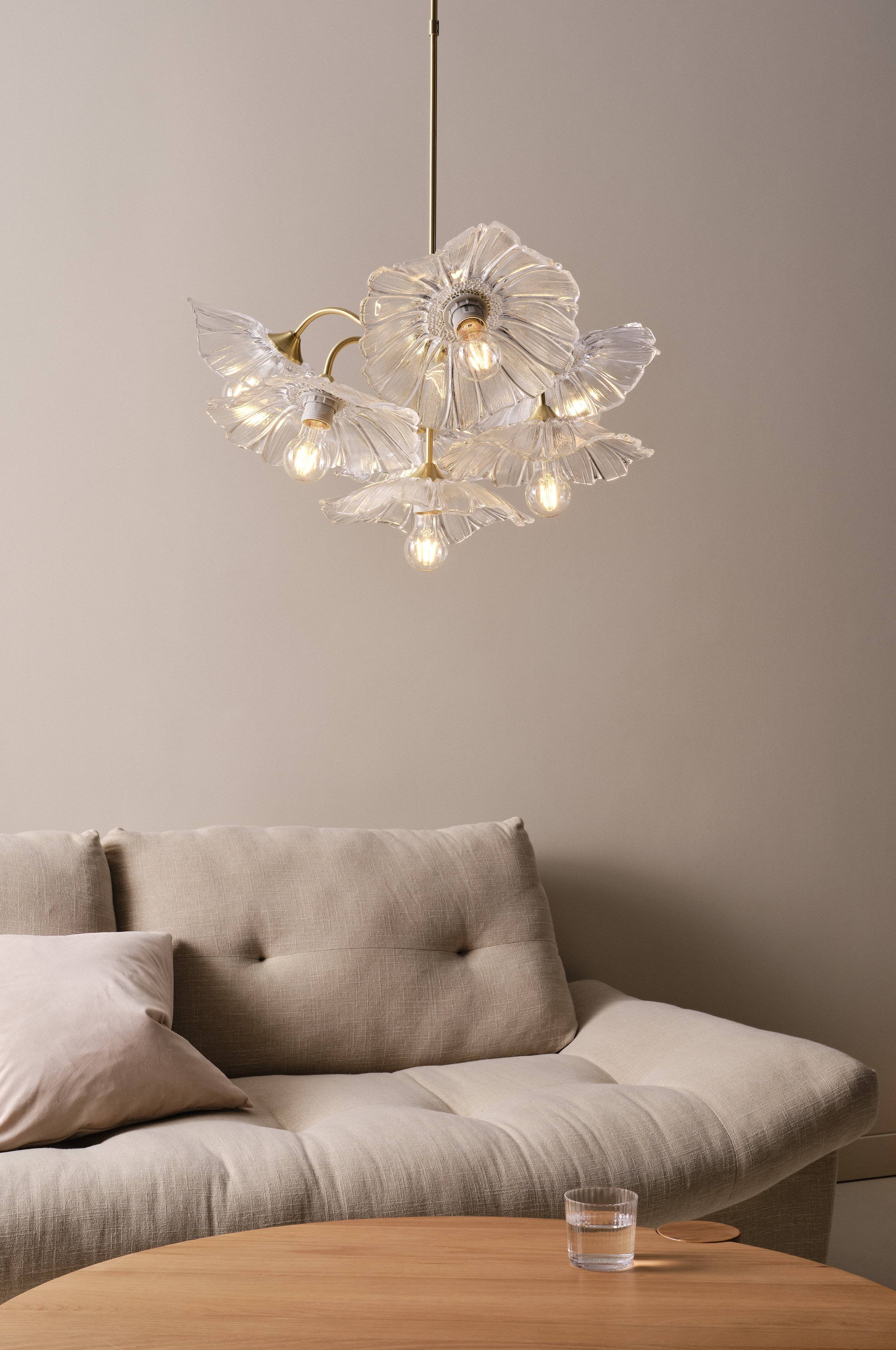 Der NUGGET-Kronleuchter ist ein atemberaubender Blickfang für dein modernes Zuhause. Mit seinem eleganten Metallsockel und den sieben exquisiten Glasschirmen, von denen jeder die bezaubernde Form einer Blume hat, bringt dieser Kronleuchter kunstvolle Beleuchtung und Charme in jeden Raum. Als Teil der NUGGET-Familie lässt er sich leicht mit passenden Objekten kombinieren und schafft so ein kohärentes und elegantes Einrichtungsthema.