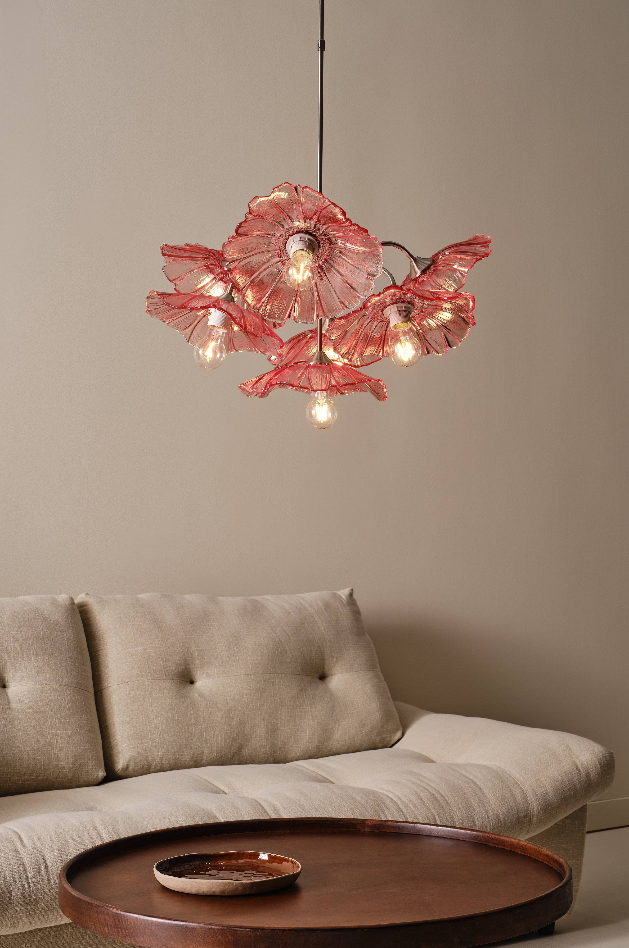 Der NUGGET-Kronleuchter ist ein atemberaubender Blickfang für dein modernes Zuhause. Mit seinem eleganten Metallsockel und den sieben exquisiten Glasschirmen, von denen jeder die bezaubernde Form einer Blume hat, bringt dieser Kronleuchter kunstvolle Beleuchtung und Charme in jeden Raum. Als Teil der NUGGET-Familie lässt er sich leicht mit passenden Objekten kombinieren und schafft so ein kohärentes und elegantes Einrichtungsthema.